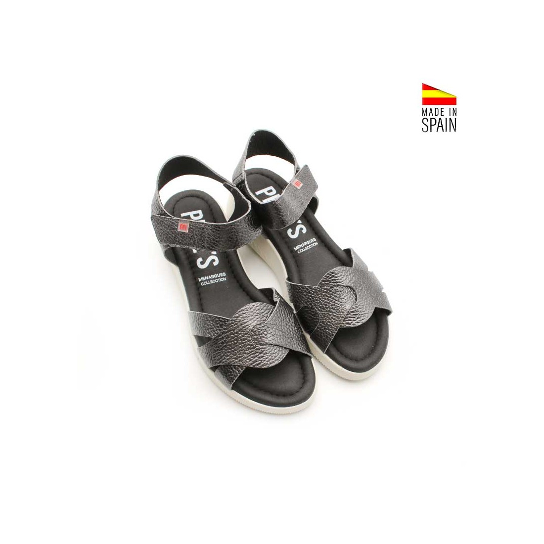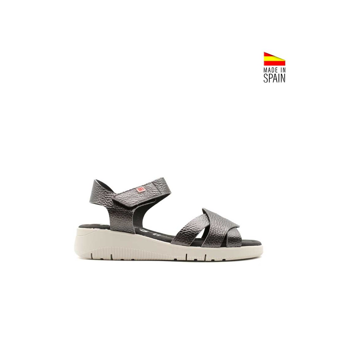 Su acabado en piel metalizada negra aporta un punto actual y elegante, manteniendo un estilo discreto y funcional. El cierre de velcro al talón permite un ajuste rápido y cómodo, adaptándose bien al pie y aportando seguridad al caminar.
