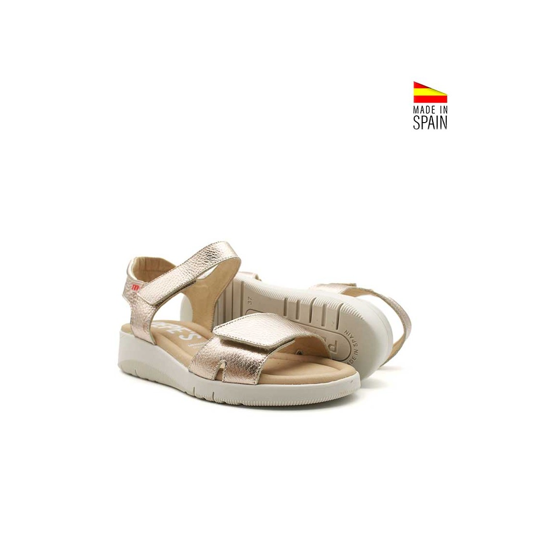 El doble cierre de velcro en el empeine y el talón permite un ajuste rápido y personalizado, ideal para quienes buscan practicidad sin complicaciones. La cuña de 4 cm, acompañada de una plataforma de 1,5 cm, estiliza de forma natural y mantiene una pisada estable y ligera.