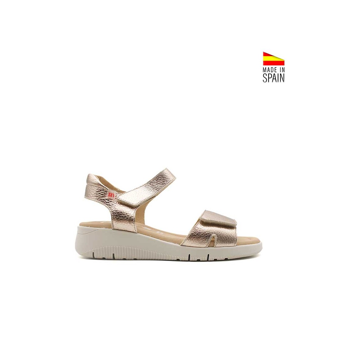Un poco de brillo nunca viene mal, y esta sandalia cuña baja dorada lo demuestra paso a paso. Su acabado metalizado aporta luz al look, mientras su diseño cómodo la convierte en una aliada perfecta para el día a día.