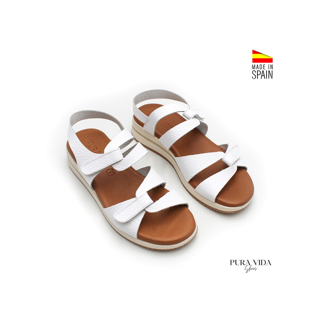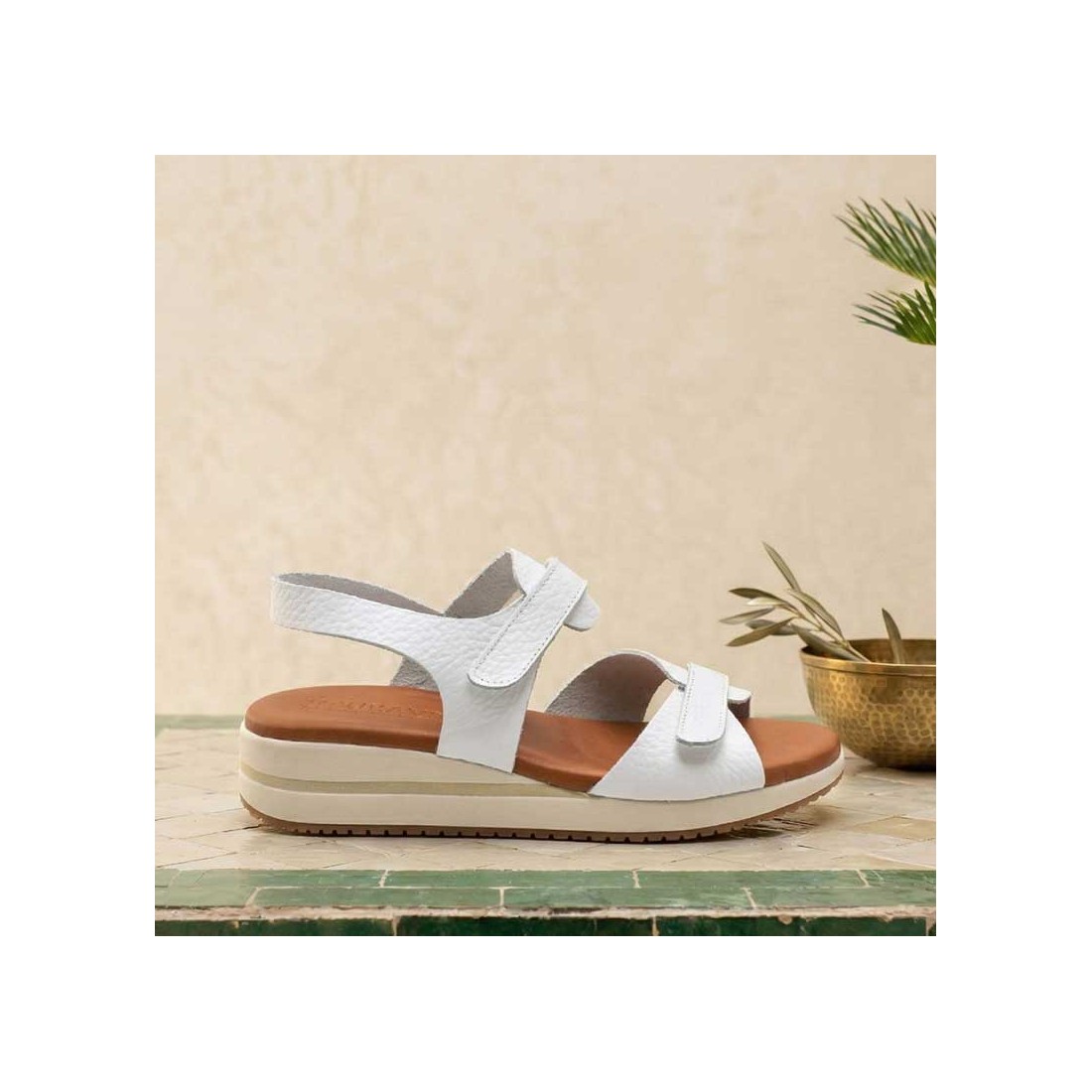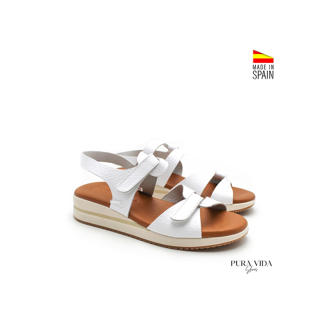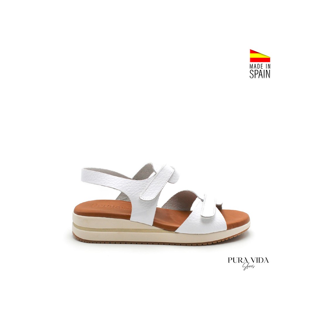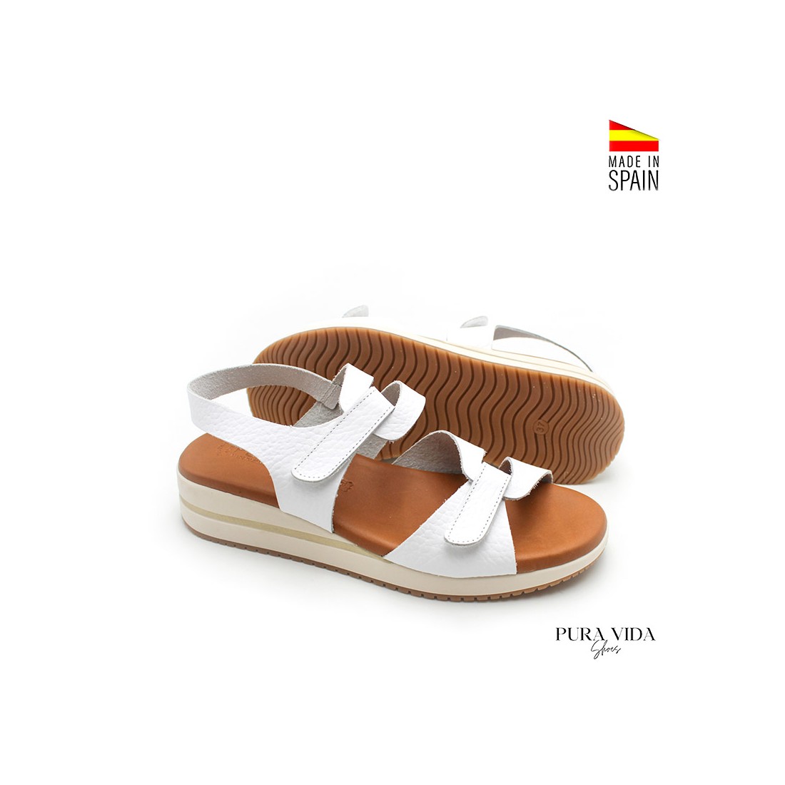 Este diseño destaca por su estructura en piel blanca, un material suave y resistente que aporta elegancia y durabilidad. Su sistema de doble cierre de velcro en el empeine permite ajustar la sandalia de forma rápida y personalizada, proporcionando una sujeción cómoda y segura.