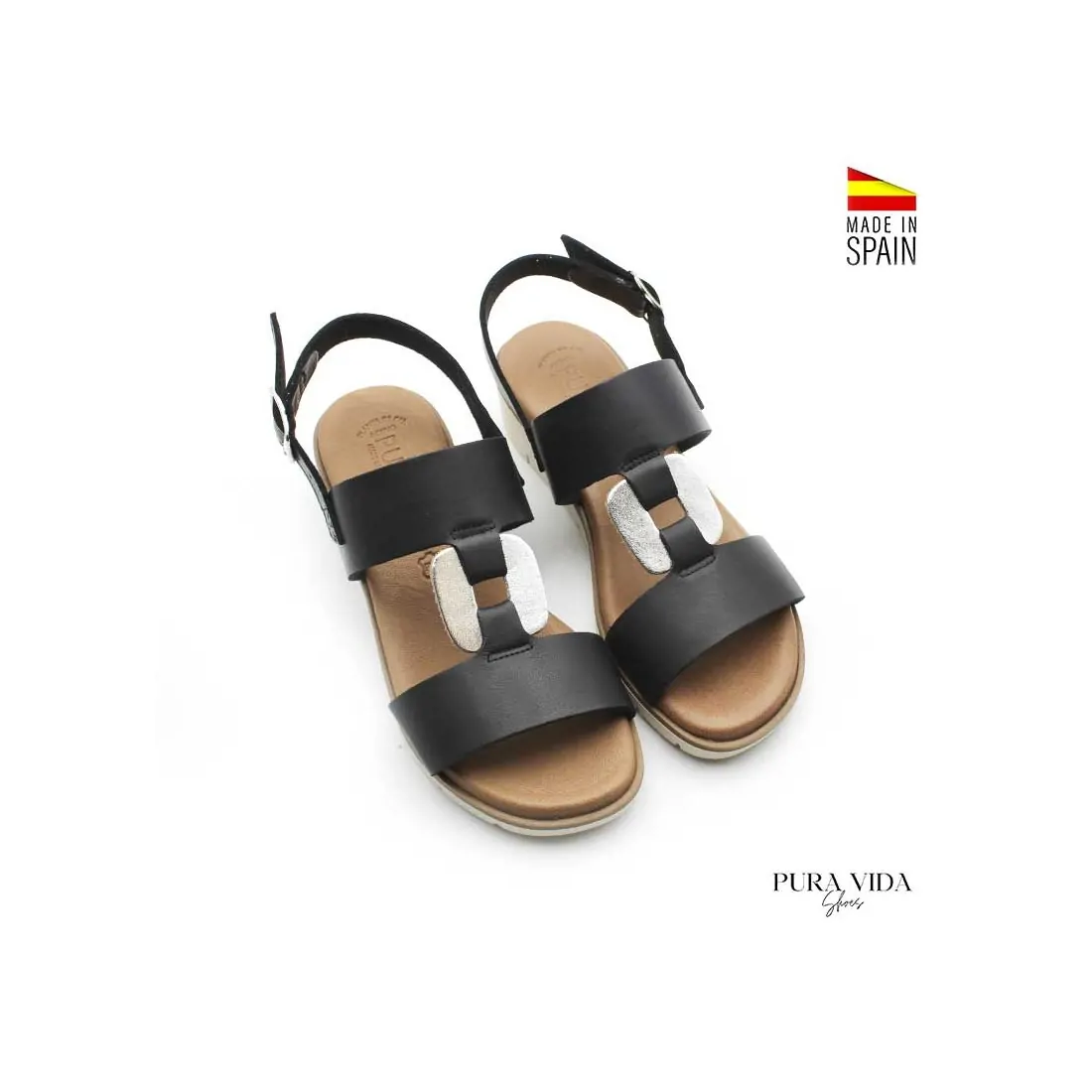 Este modelo en color negro presenta un diseño de doble tira al empeine unidas por una pieza central plateada. La tira trasera con hebilla ajustable garantiza un ajuste seguro y personalizado.