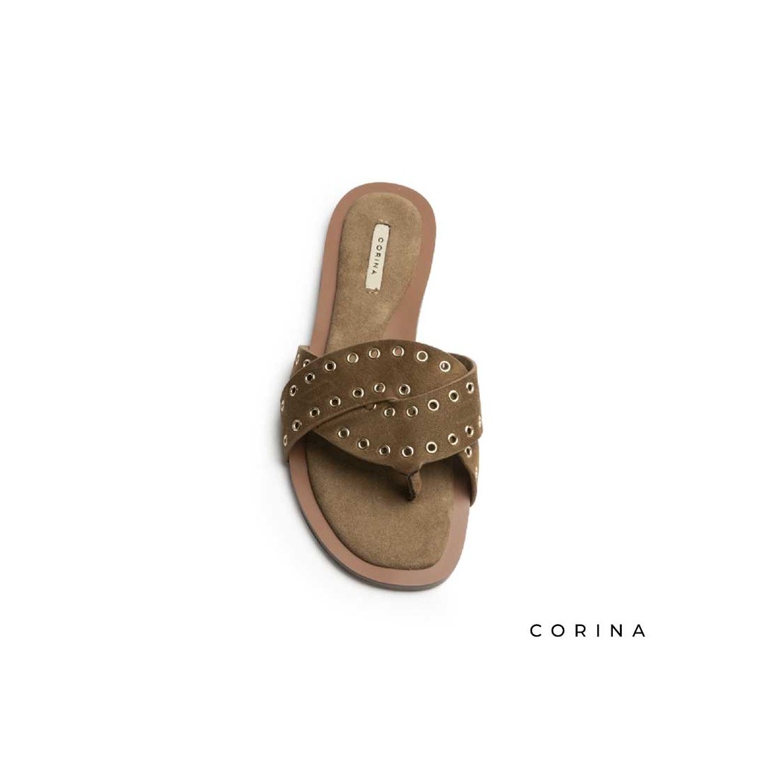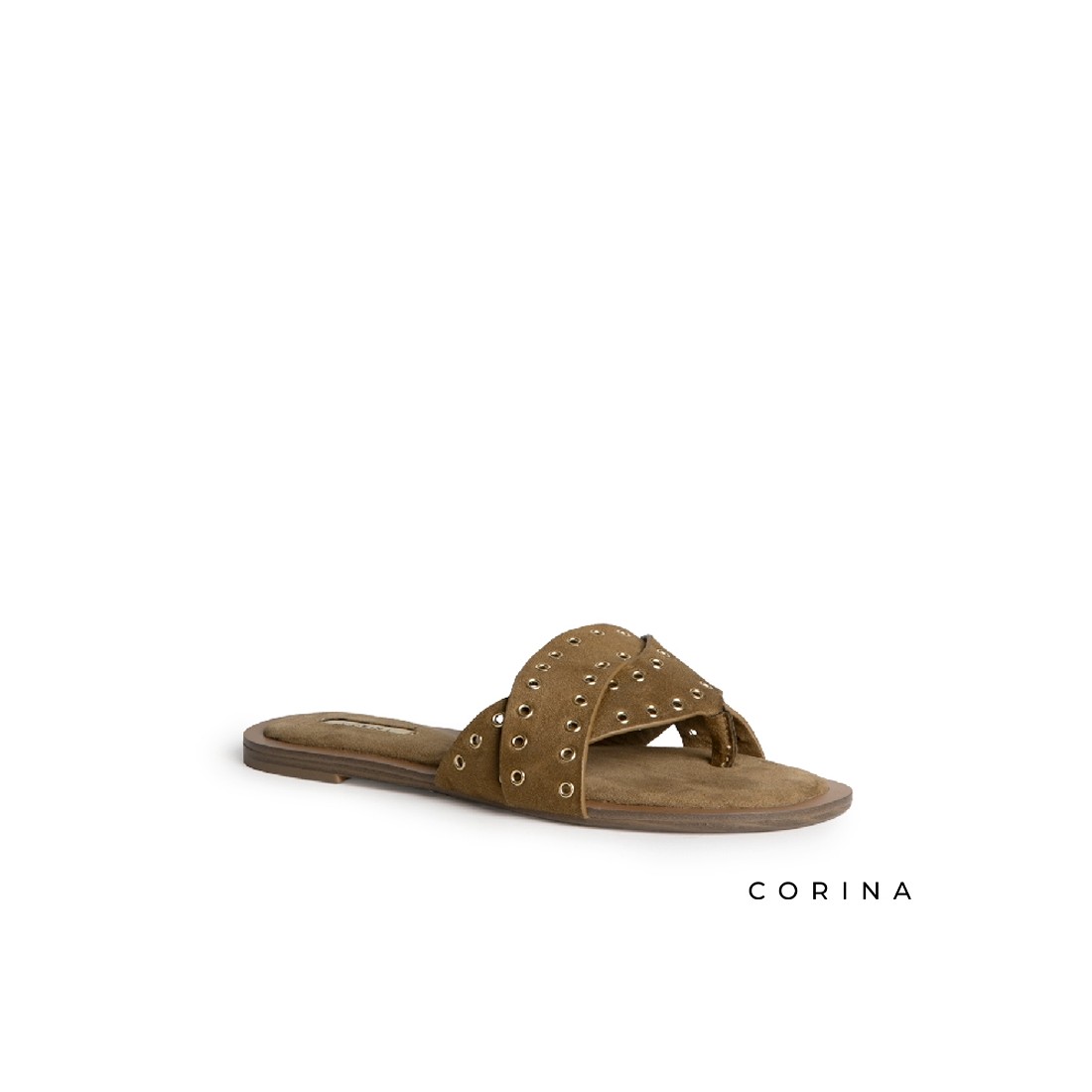 El acabado en antelina camel aporta luminosidad y combina fácilmente con tonos neutros, blancos, denim o looks tierra. Los ojales metálicos decorativos añaden un matiz moderno que rompe con la sencillez del diseño, creando una sandalia versátil con personalidad propia.