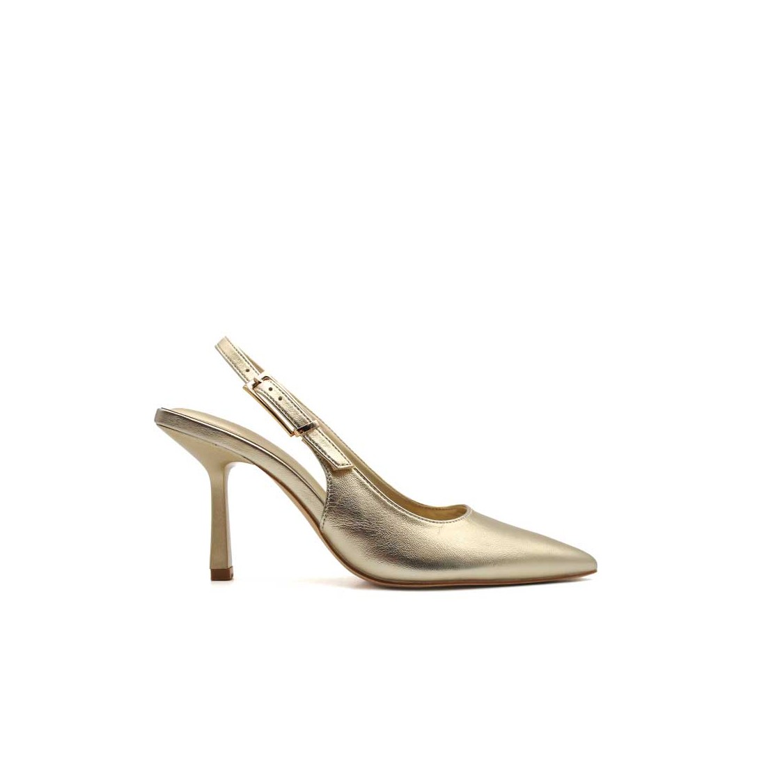 Este stiletto destalonado cuenta con punta fina, tira trasera con hebilla ajustable y un tacón fino de 8,5 cm, ideal para estilizar la figura sin renunciar a la comodidad.