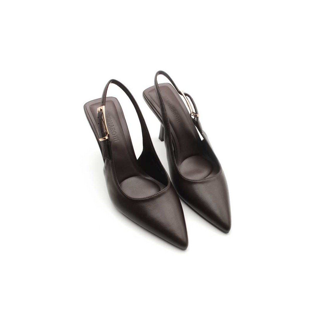 Su diseño destalonado con tira y hebilla ajustable aporta un guiño moderno sin complicaciones, mientras que la punta afilada tipo stiletto estiliza el pie con carácter.