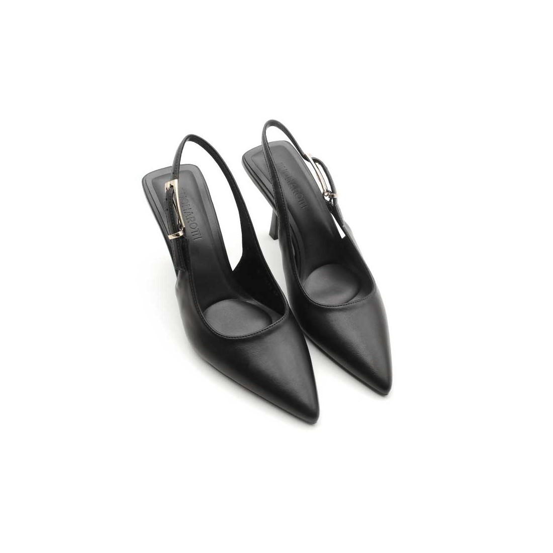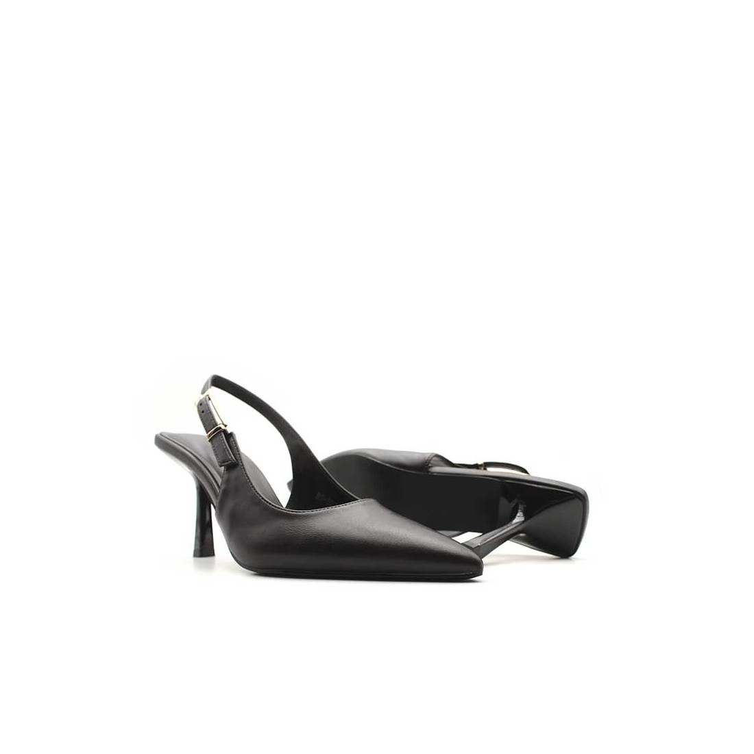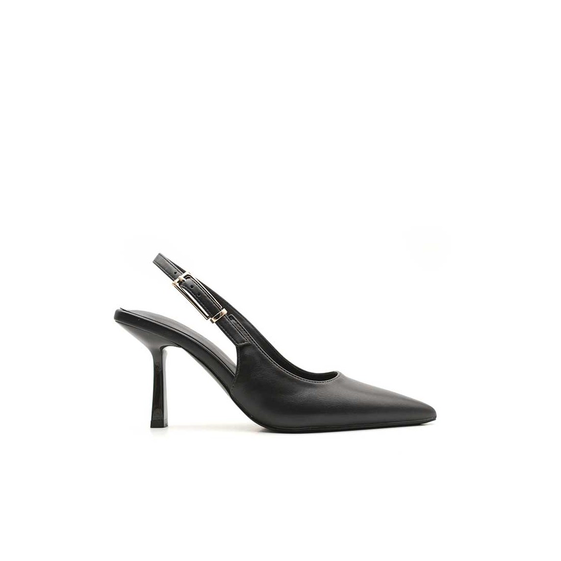 Un stiletto destalonado con punta afilada y cierre de hebilla que habla por sí solo.