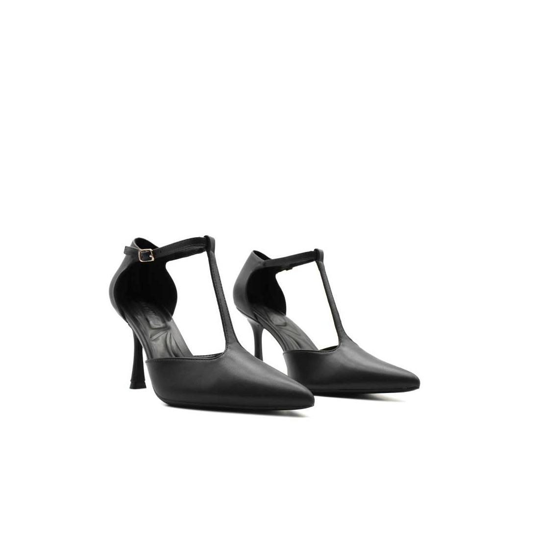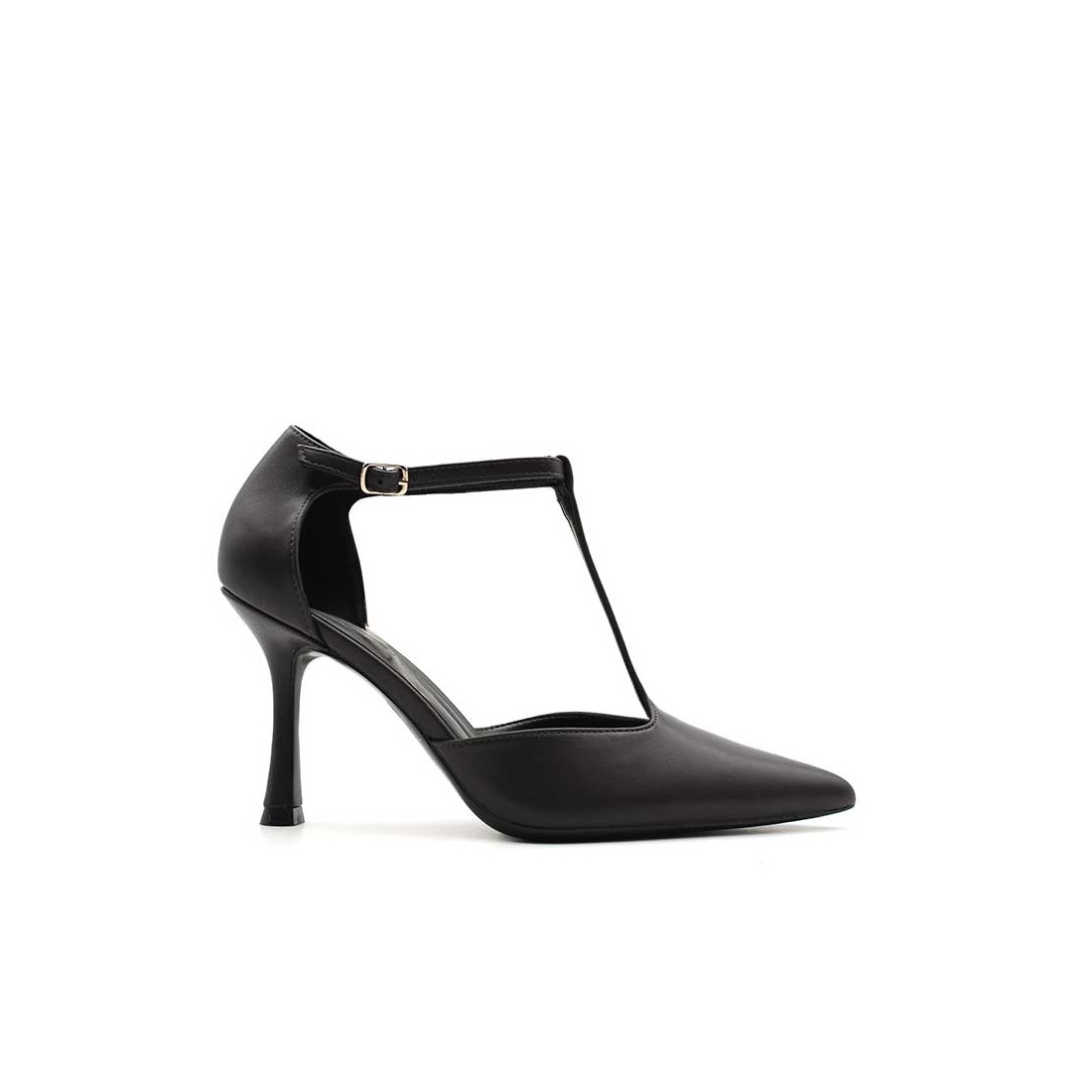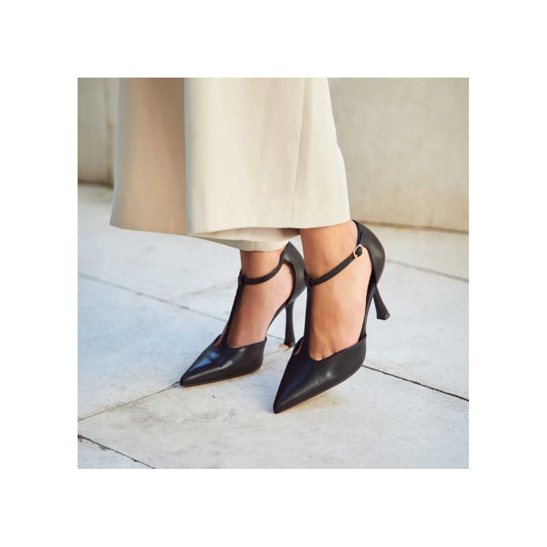 Su diseño tipo stiletto con pulsera en forma de T abraza el empeine y estiliza la pierna, aportando un aire moderno con un toque de rebeldía.
