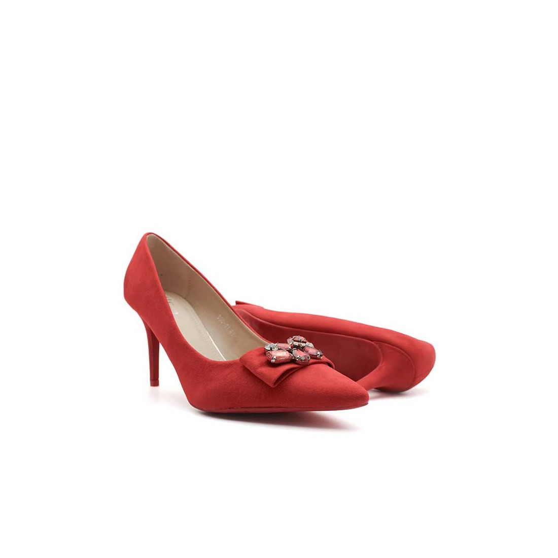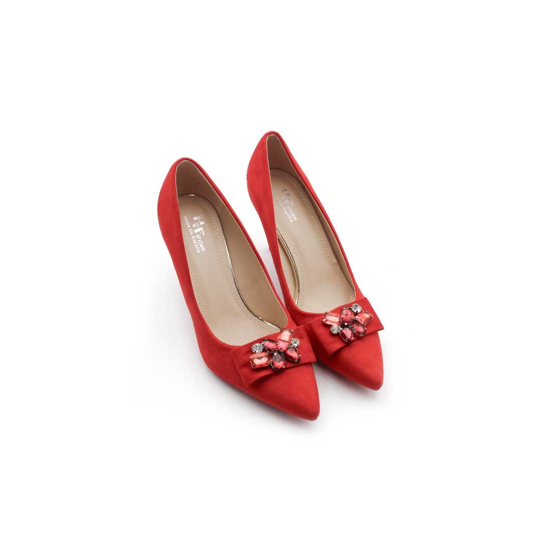 Estos salones de antelina en color rojo son perfectos para quienes buscan un zapato llamativo, elegante y con un toque especial.