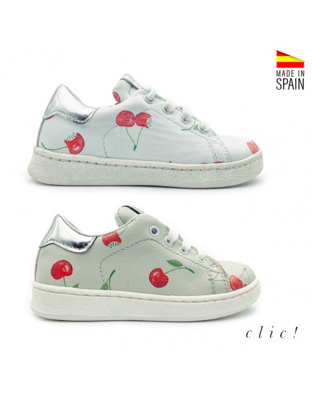 Este modelo de bamba deportiva para niña es de color blanco o en gris con cerezas, disponible en varios colores, con trasera metalizada y suela de goma blanca antideslizante.