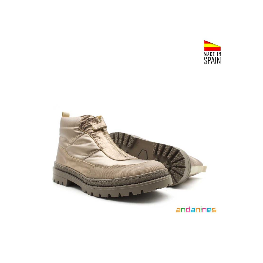 Su diseño incorpora una práctica cremallera delantera que facilita el calce, junto a una puntera de goma reforzada que protege el pie frente al uso diario.