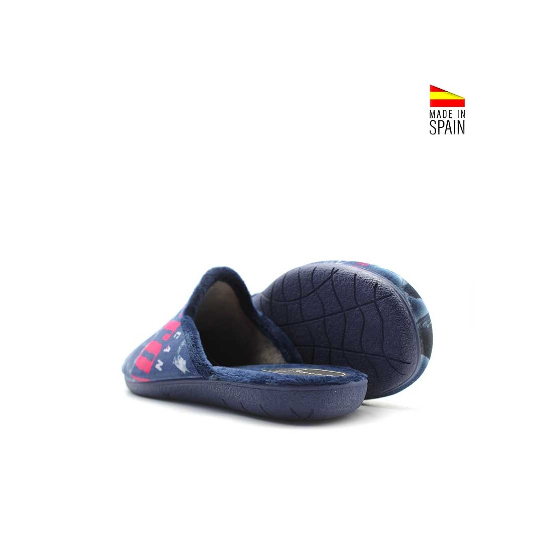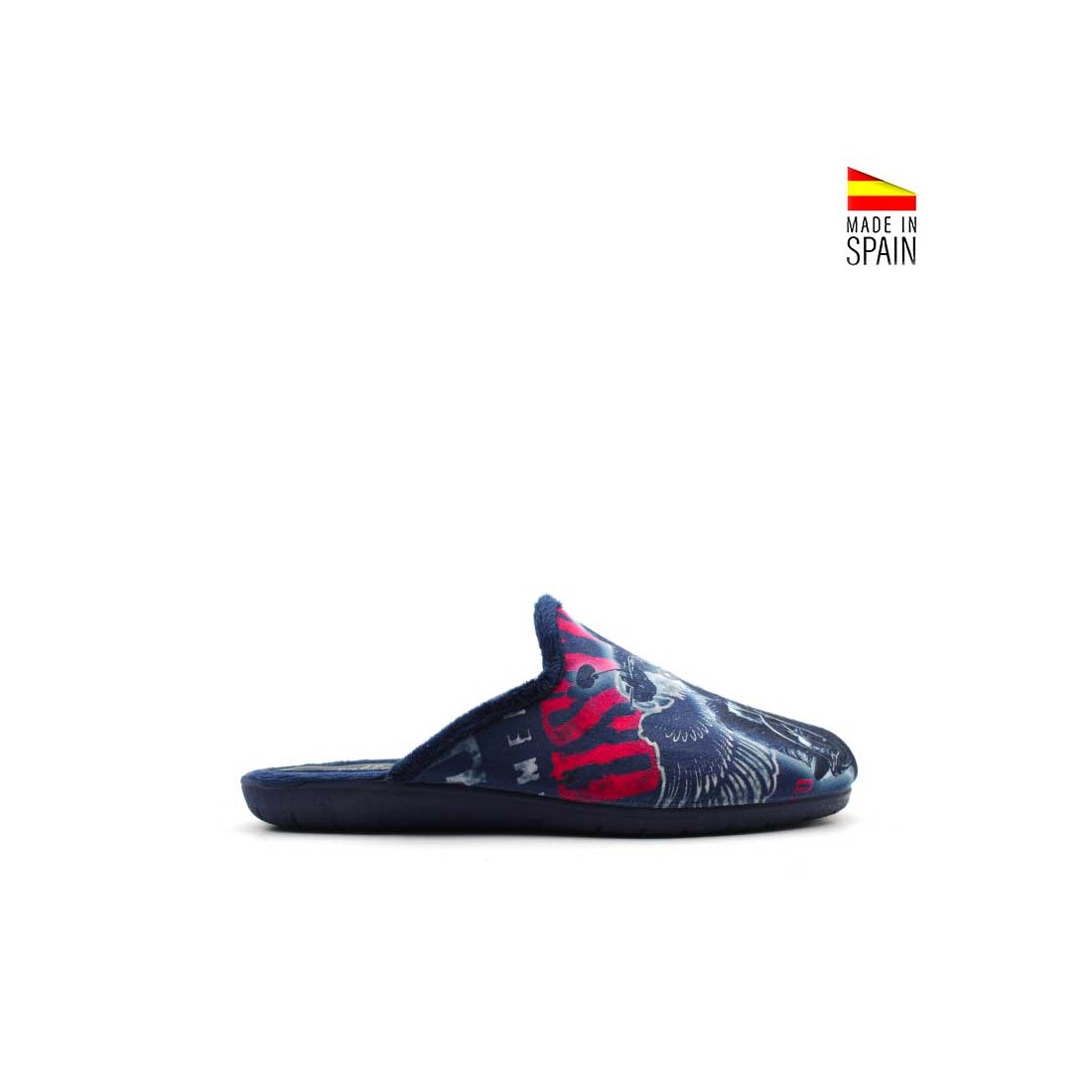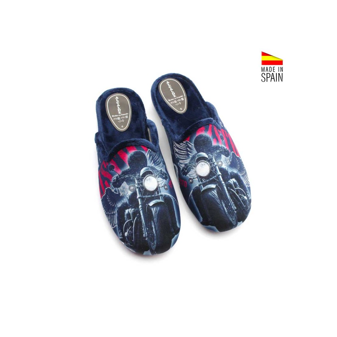El exterior aterciopelado resalta su diseño motero con una moto estampada, un detalle atrevido que marca la diferencia y aporta un aire auténtico y original a tu calzado de estar en casa.