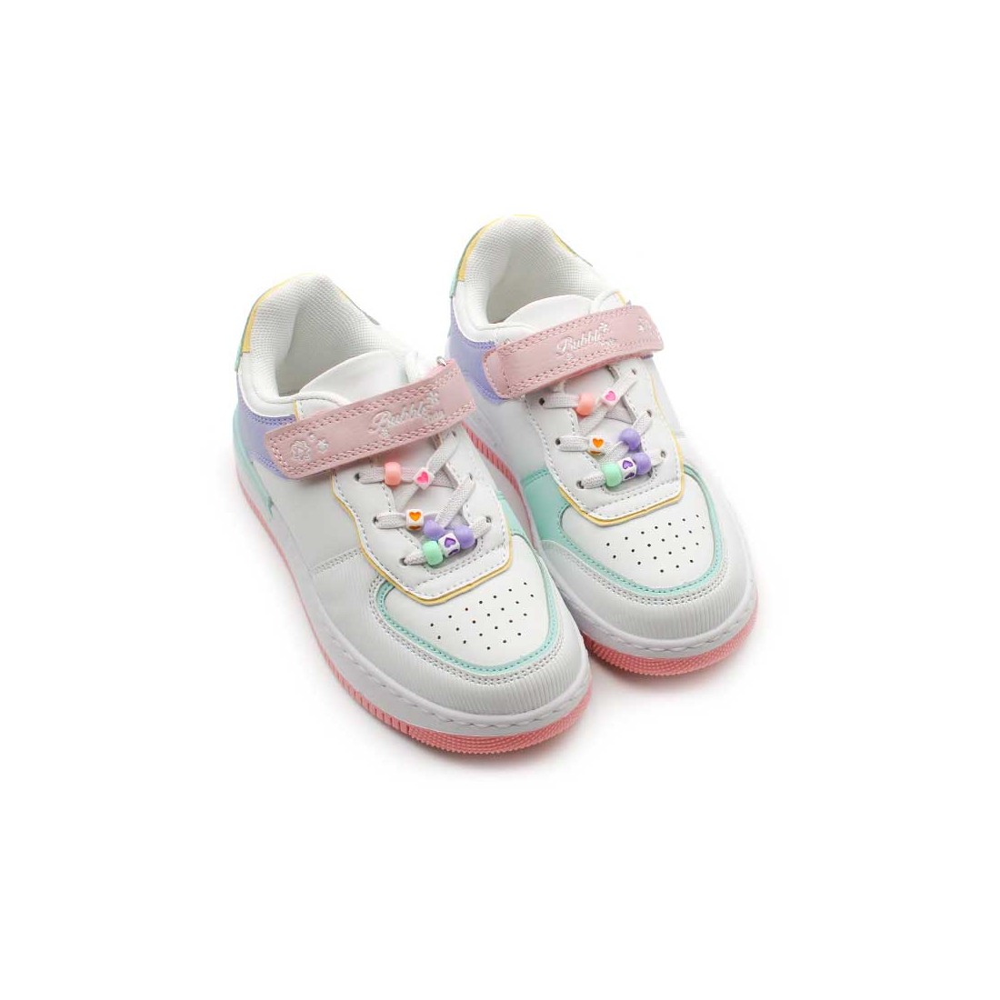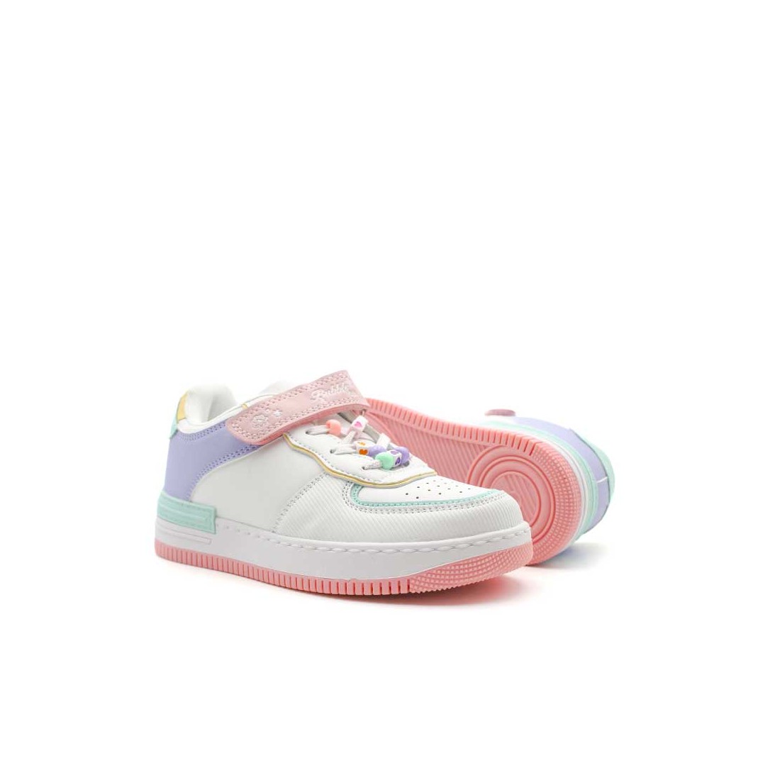 Este modelo deportivo tipo bamba force combina un diseño cómodo y actual con una estética divertida gracias a su puntera redonda perforada y diseño multicolor en tonos pastel: azul, rosa, verde, amarillo y lila.