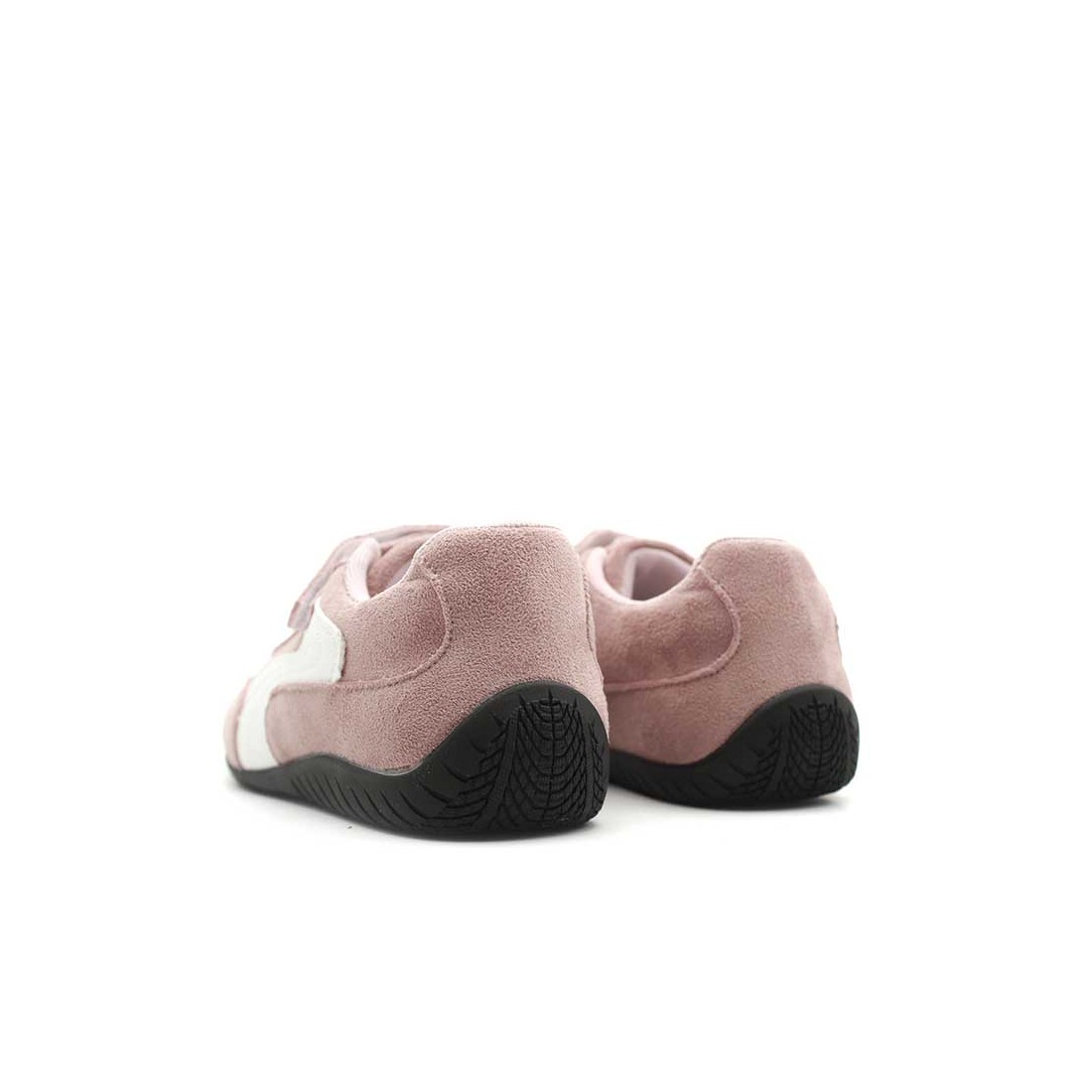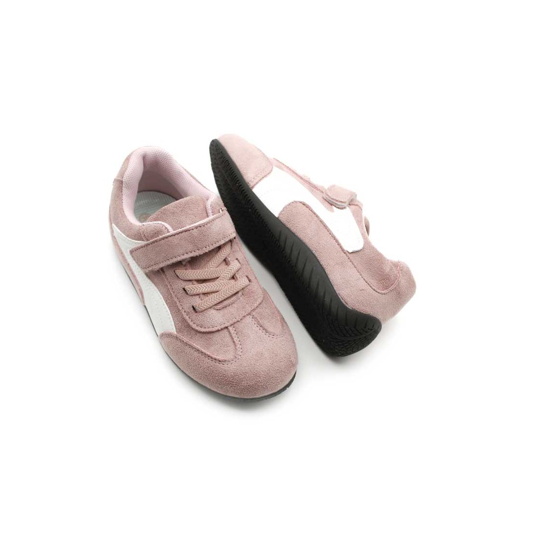 El diseño en color rosa de suave antelina, junto con las rayas laterales en color blanco, aporta un estilo moderno y desenfadado, fácil de combinar con looks casuales y escolares.