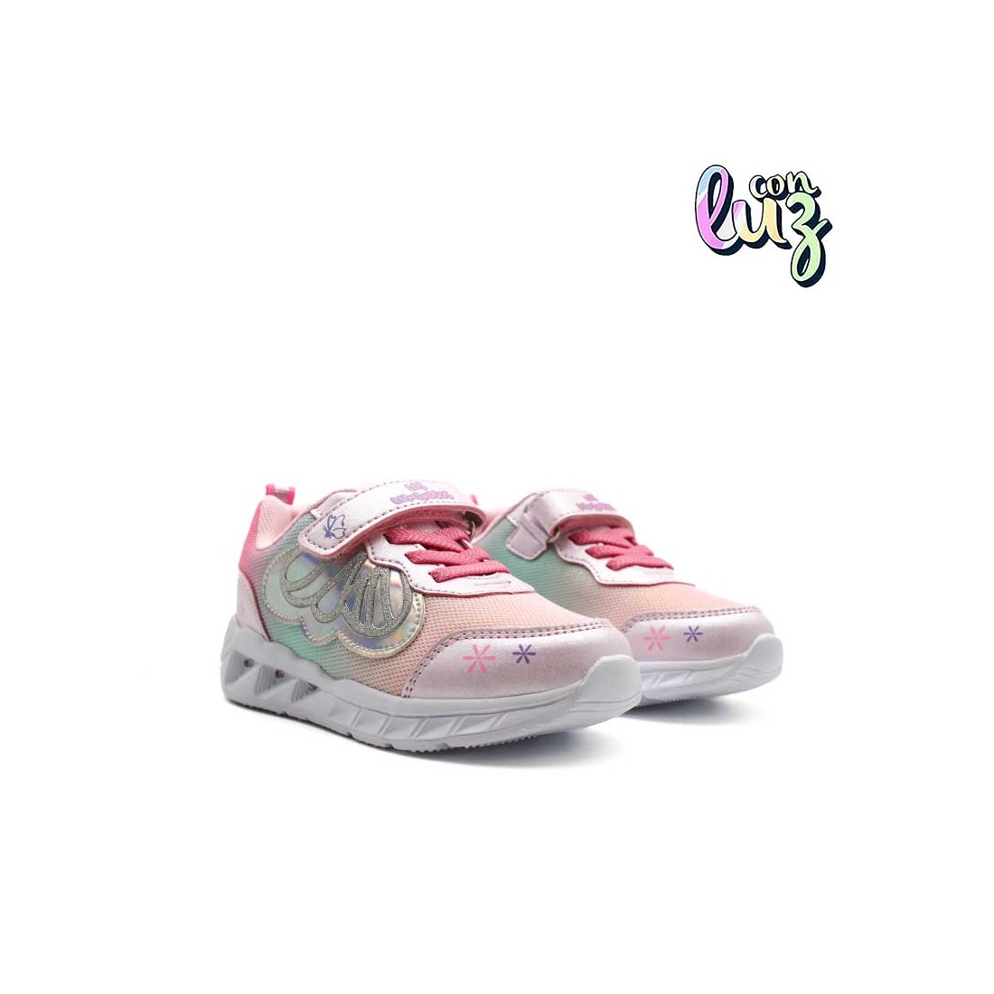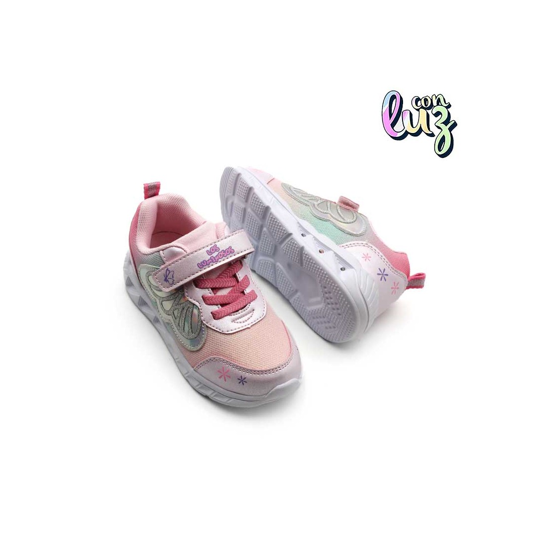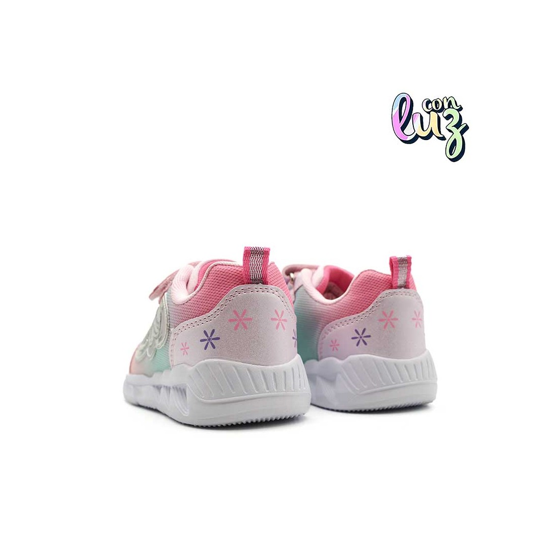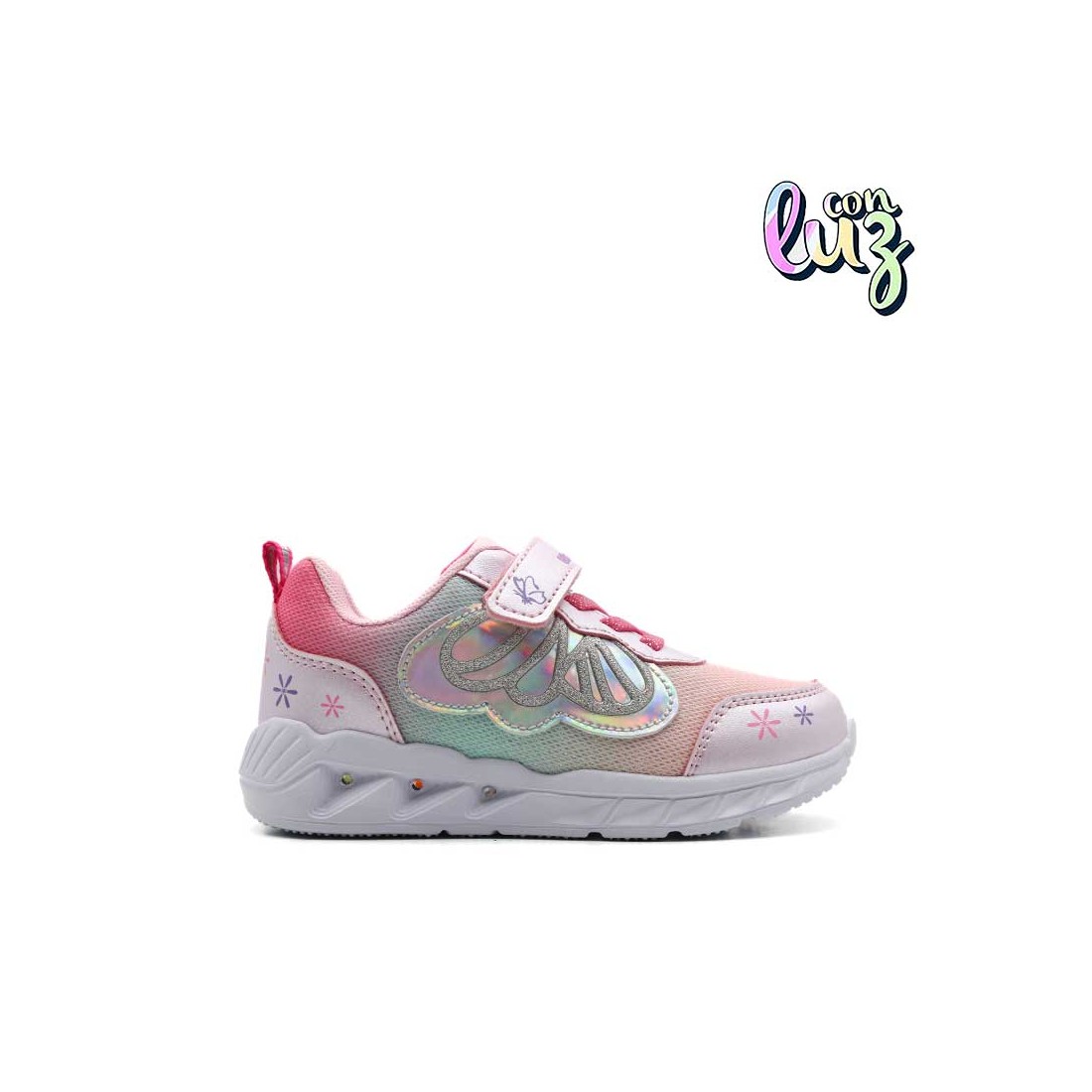 La suela es ligera en microporoso, con ventanitas laterales que se iluminan al caminar para que cada paso sea una fiesta.