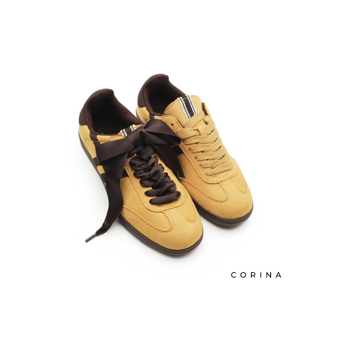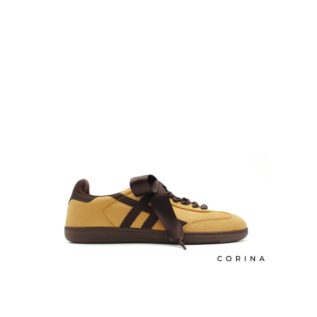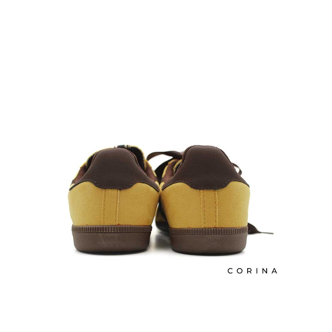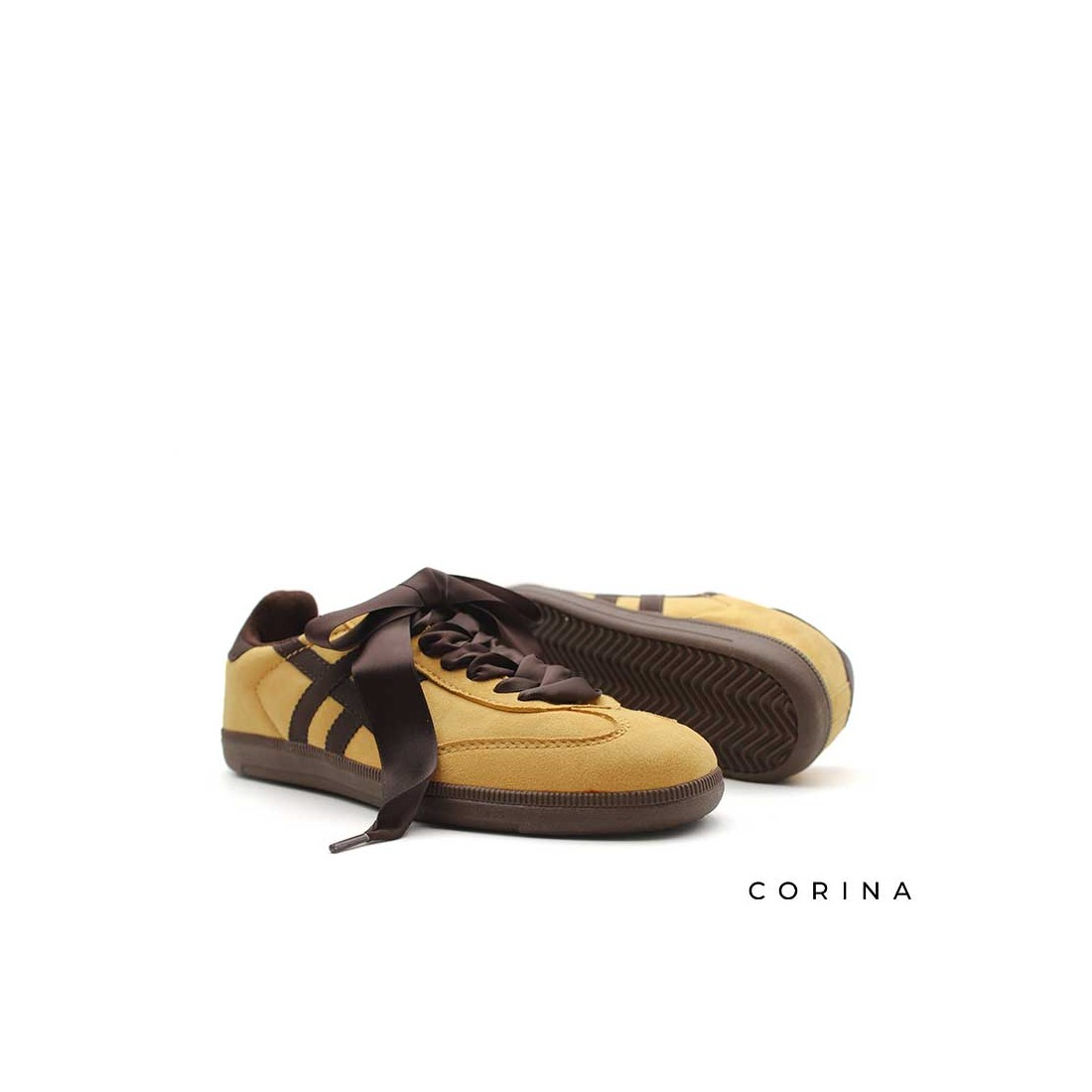 Diseño en antelina en un vibrante tono mostaza, destacan por los detalles en marrón chocolate que crean un contraste elegante y moderno.