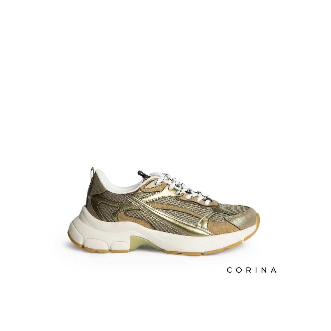 Su diseño chunky con suela gruesa aporta altura y comodidad en cada paso, mientras que la combinación de malla transpirable, efecto metalizado dorado y detalles en polipiel le dan un acabado moderno y sofisticado.