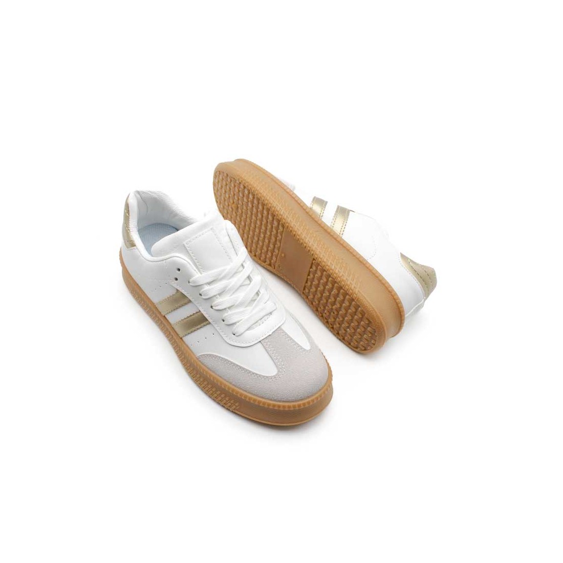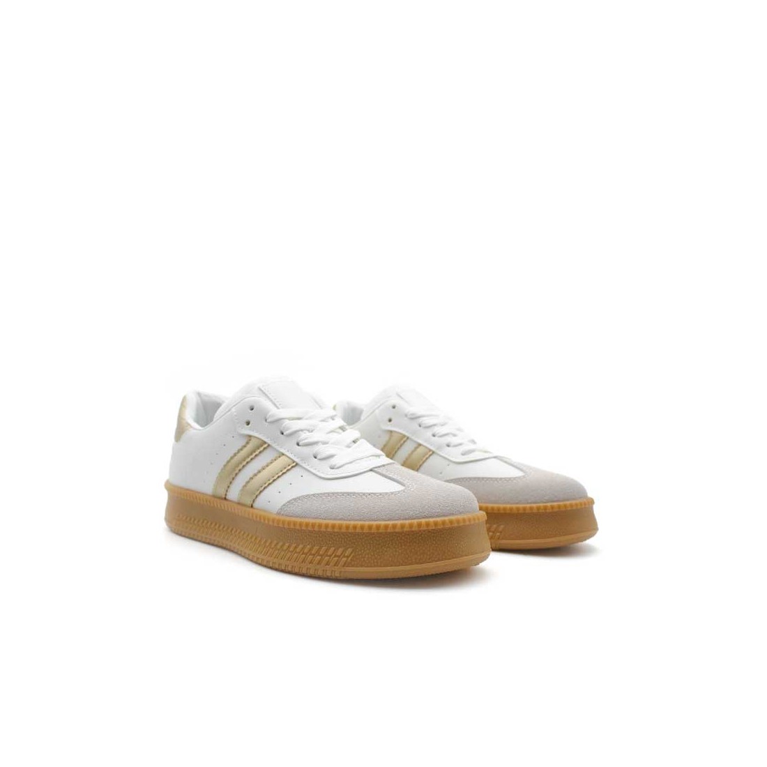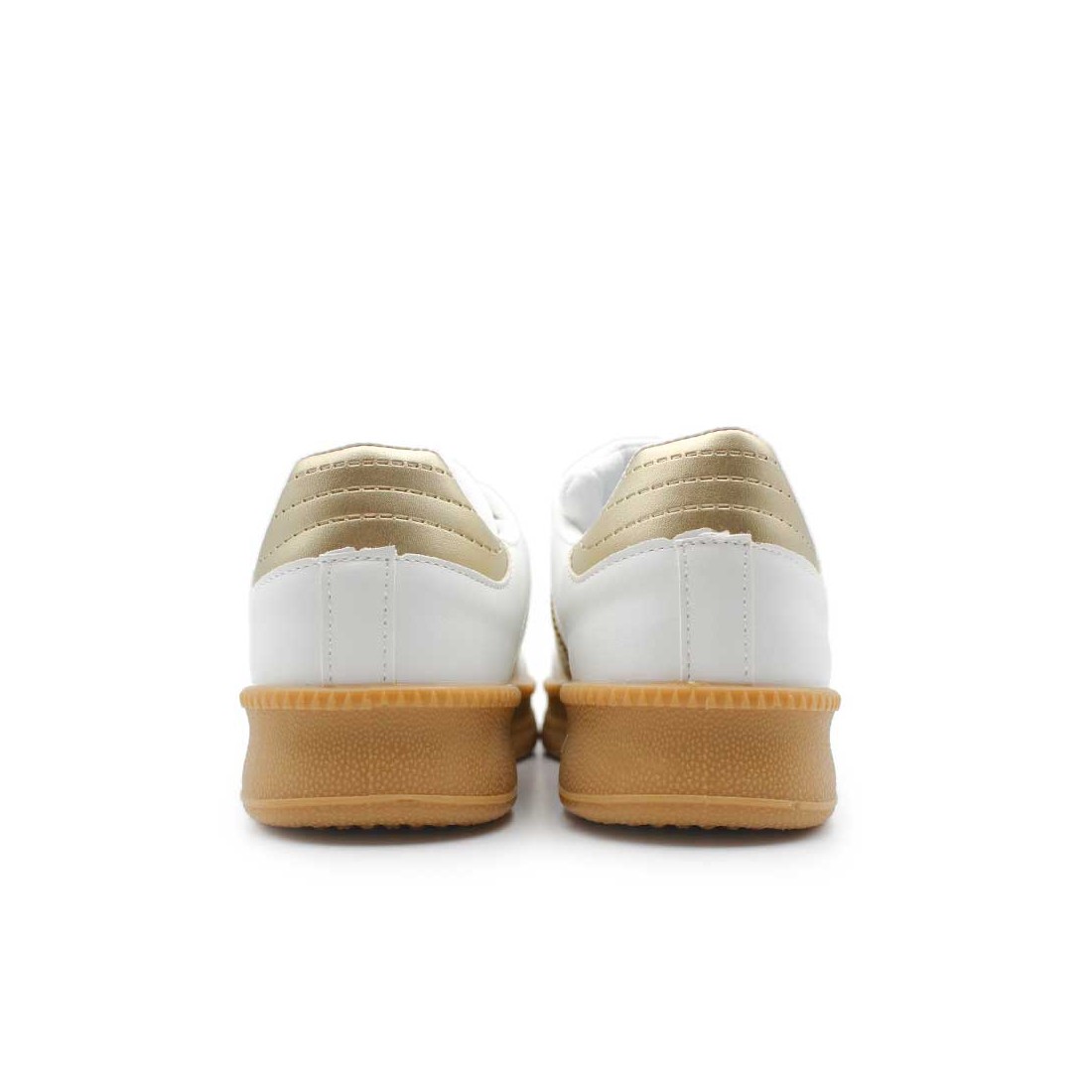 Su diseño en blanco con puntera en gris y detalles en dorado en el talón y rayas laterales marcan tendencia en cada pisada.