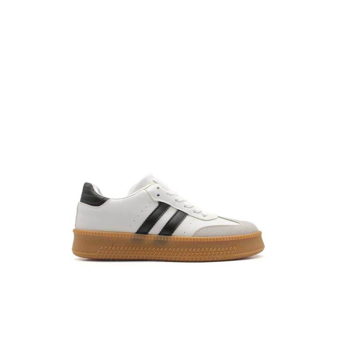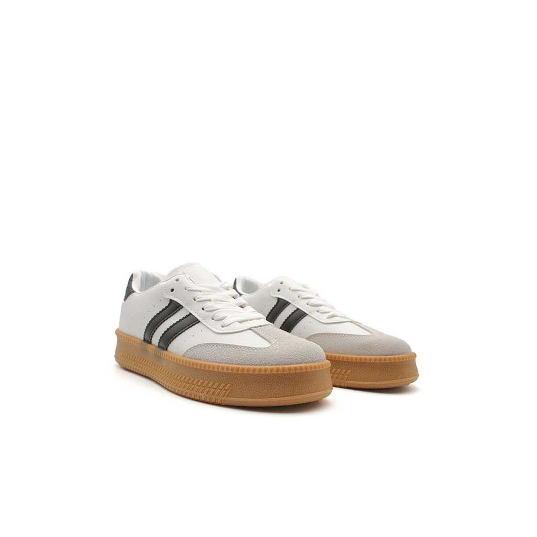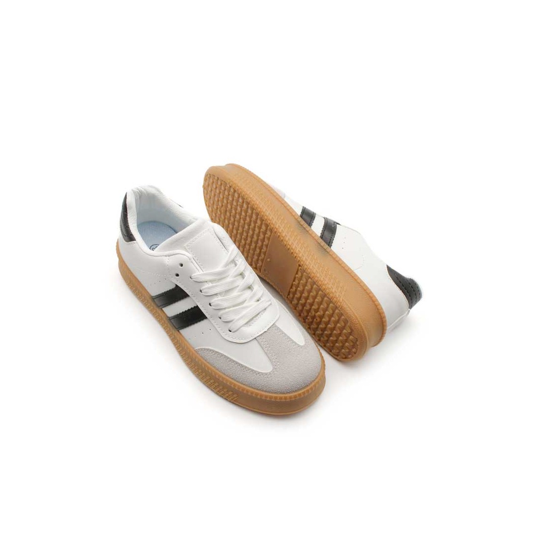 Este modelo para mujer combina el blanco atemporal con una puntera en gris y rayas laterales en negro que aportan contraste y estilo. Su diseño tipo bamba es perfecto para el día a día, desde pasear por la ciudad hasta combinar con tus outfits más casuales.