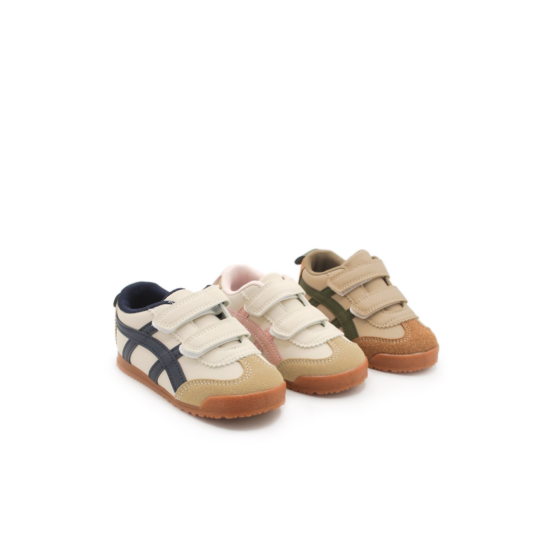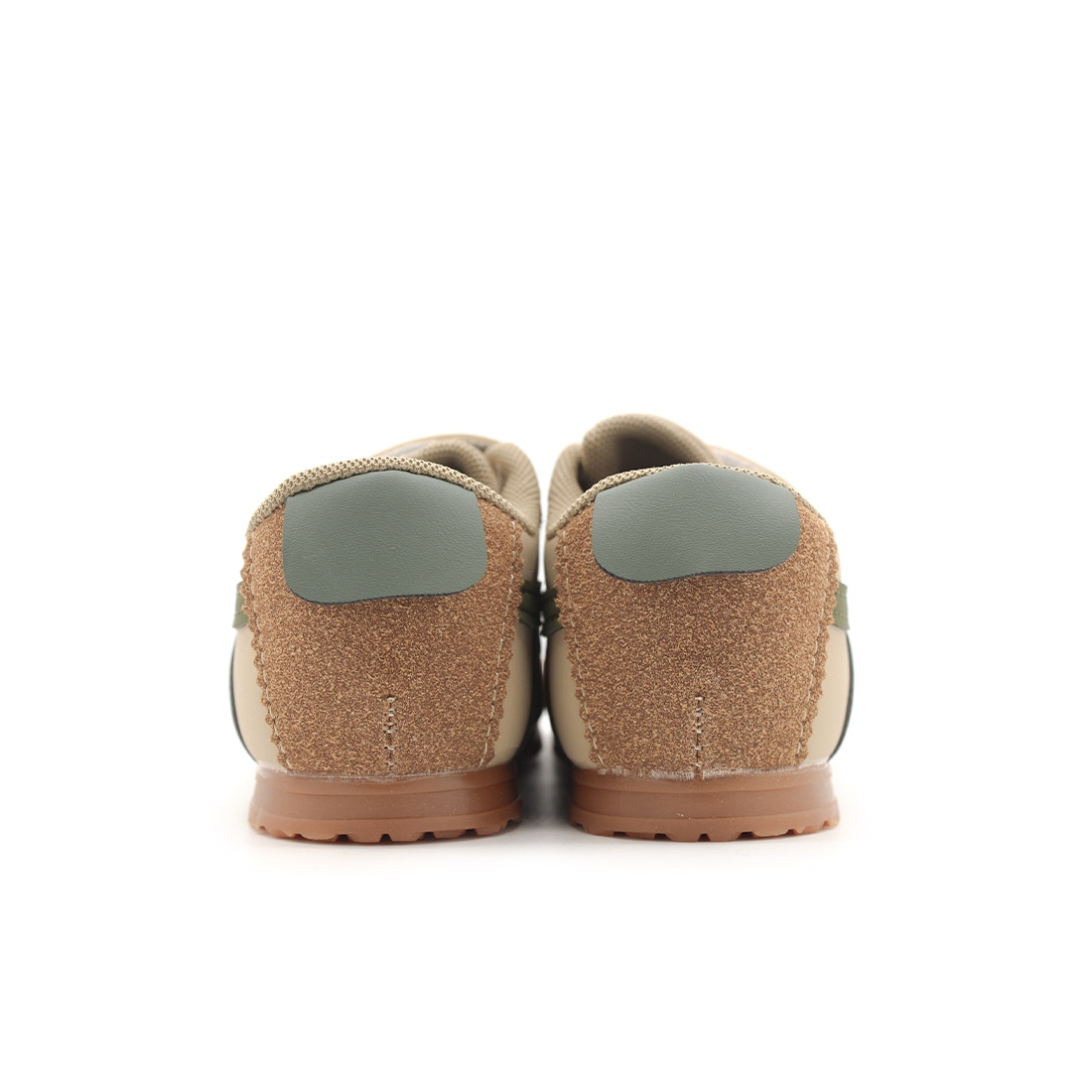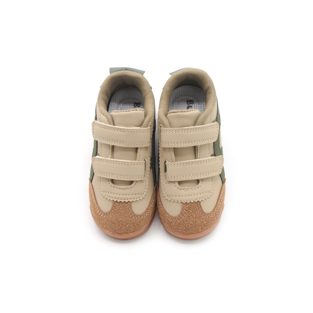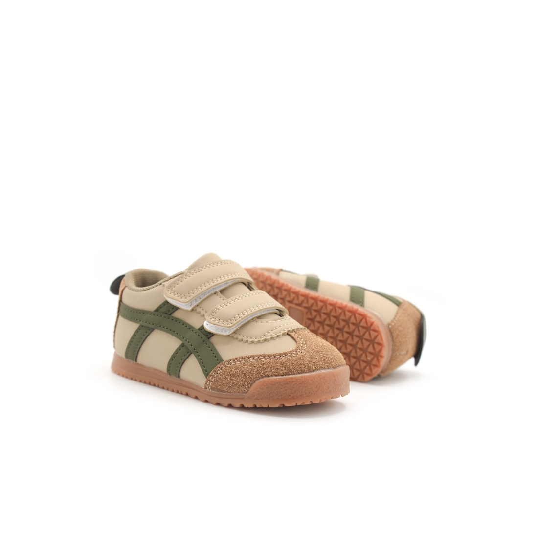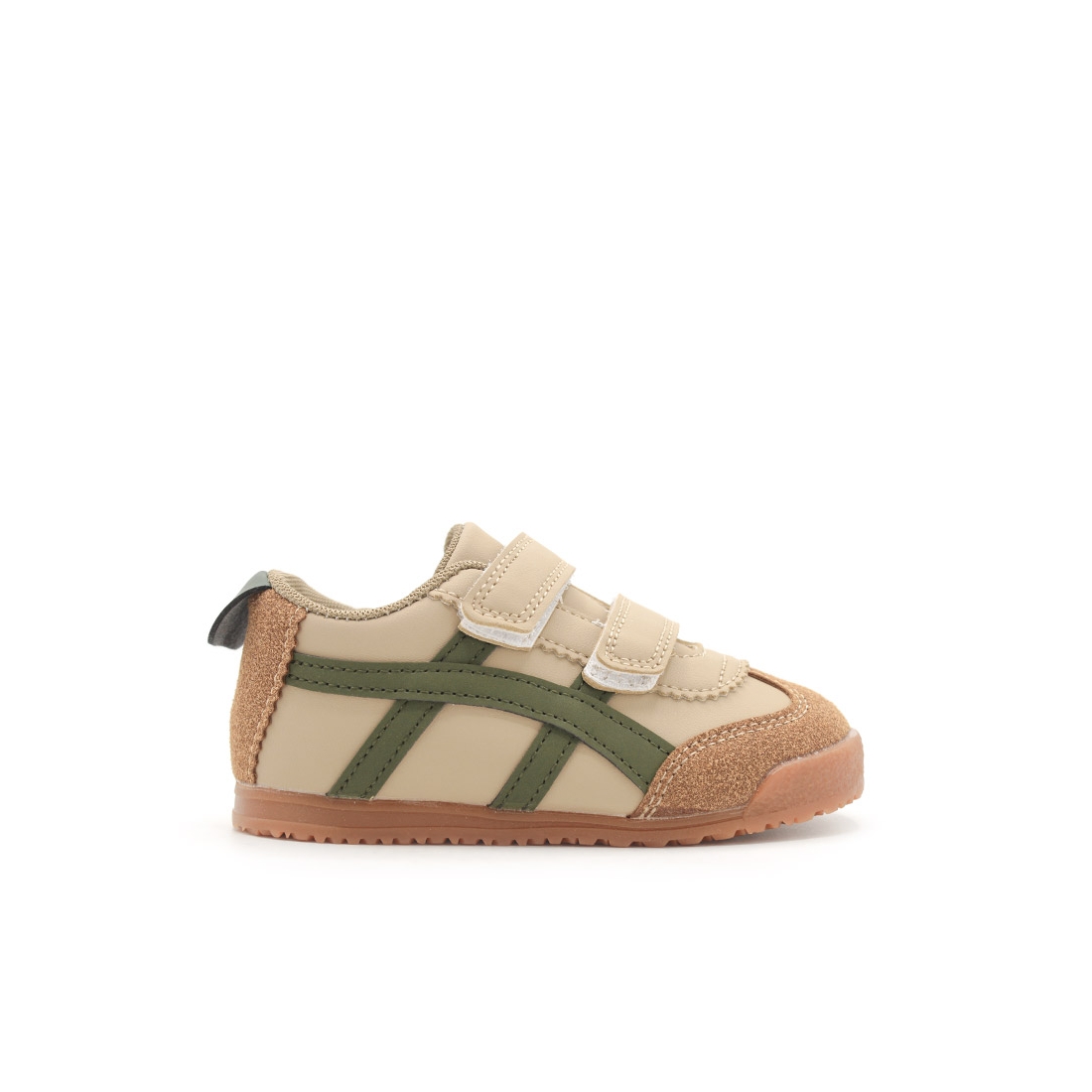 El diseño en color blanco beige con detalles en verde militar le da un toque moderno y versátil que combina con cualquier look. Ya sea para ir al parque, a la escuela o para una salida familiar, estas zapatillas son el complemento ideal. Además, la puntera y talón en color camel de antelina no solo refuerzan las zonas más expuestas al desgaste, sino que también añaden un toque retro y duradero al calzado.