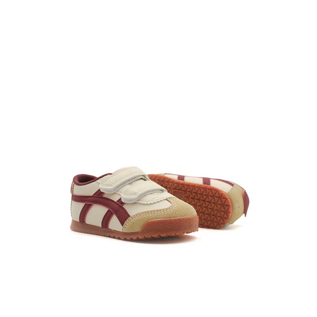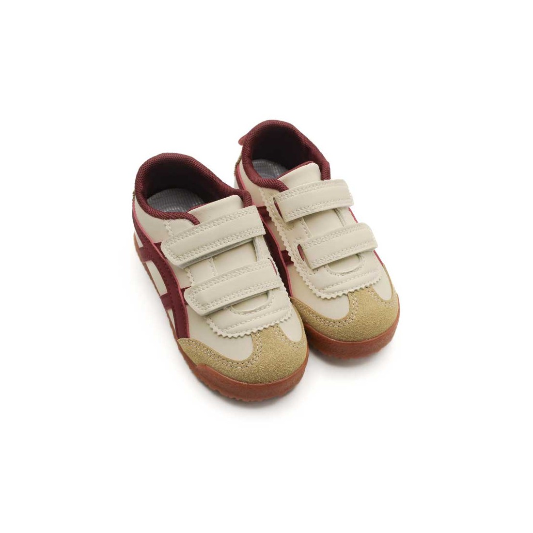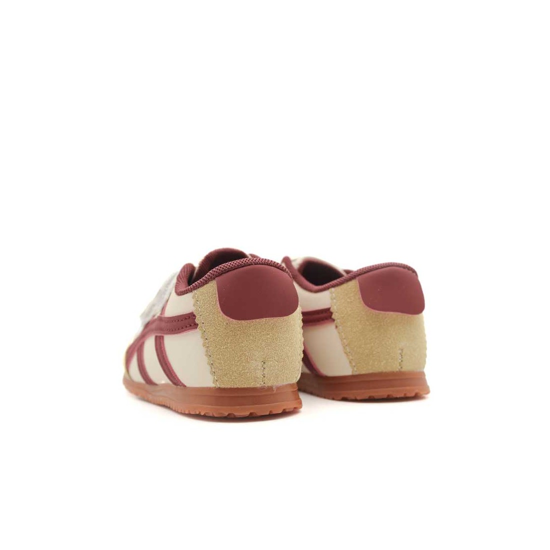 Con un diseño unisex, combinan el color beige con detalles burdeos en un estilo retro y casual muy actual.