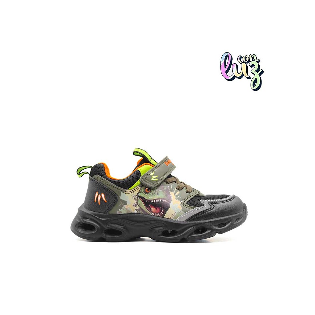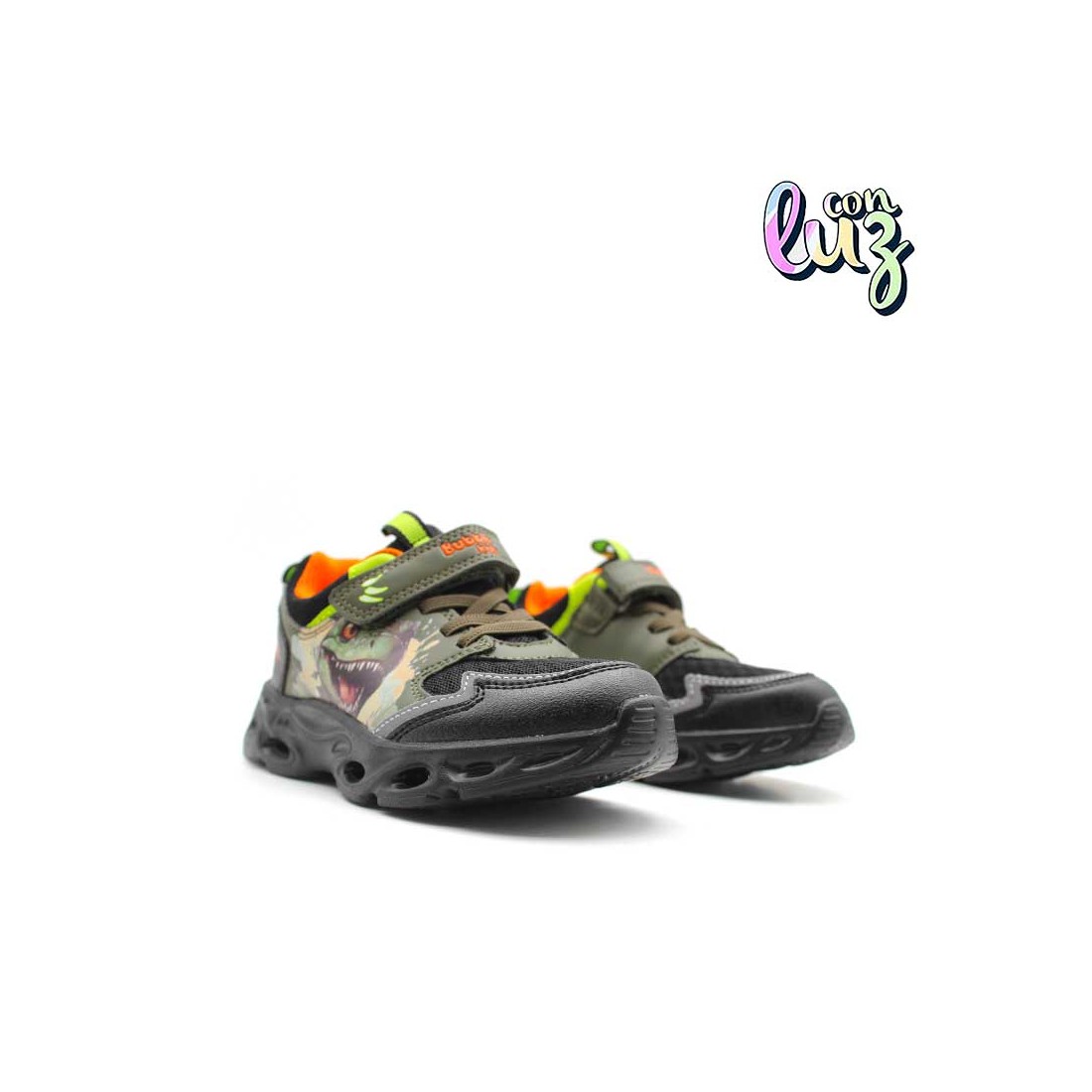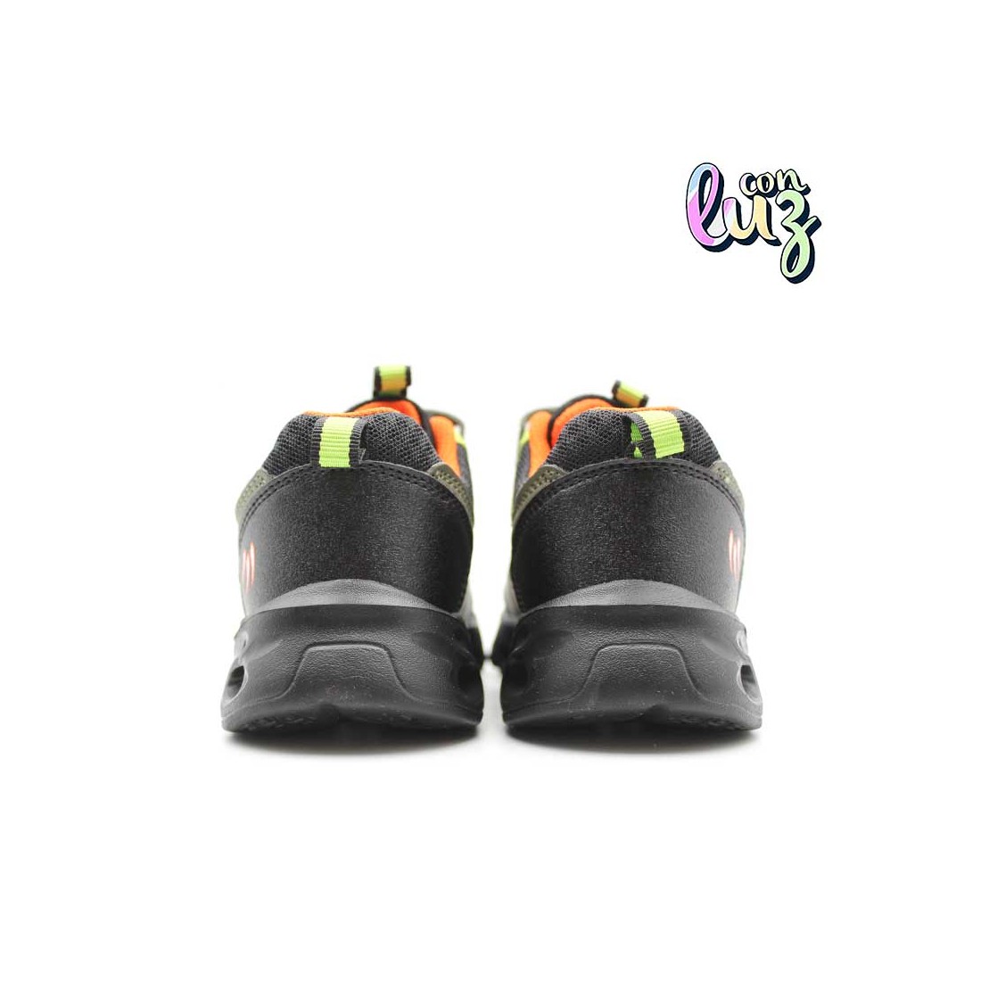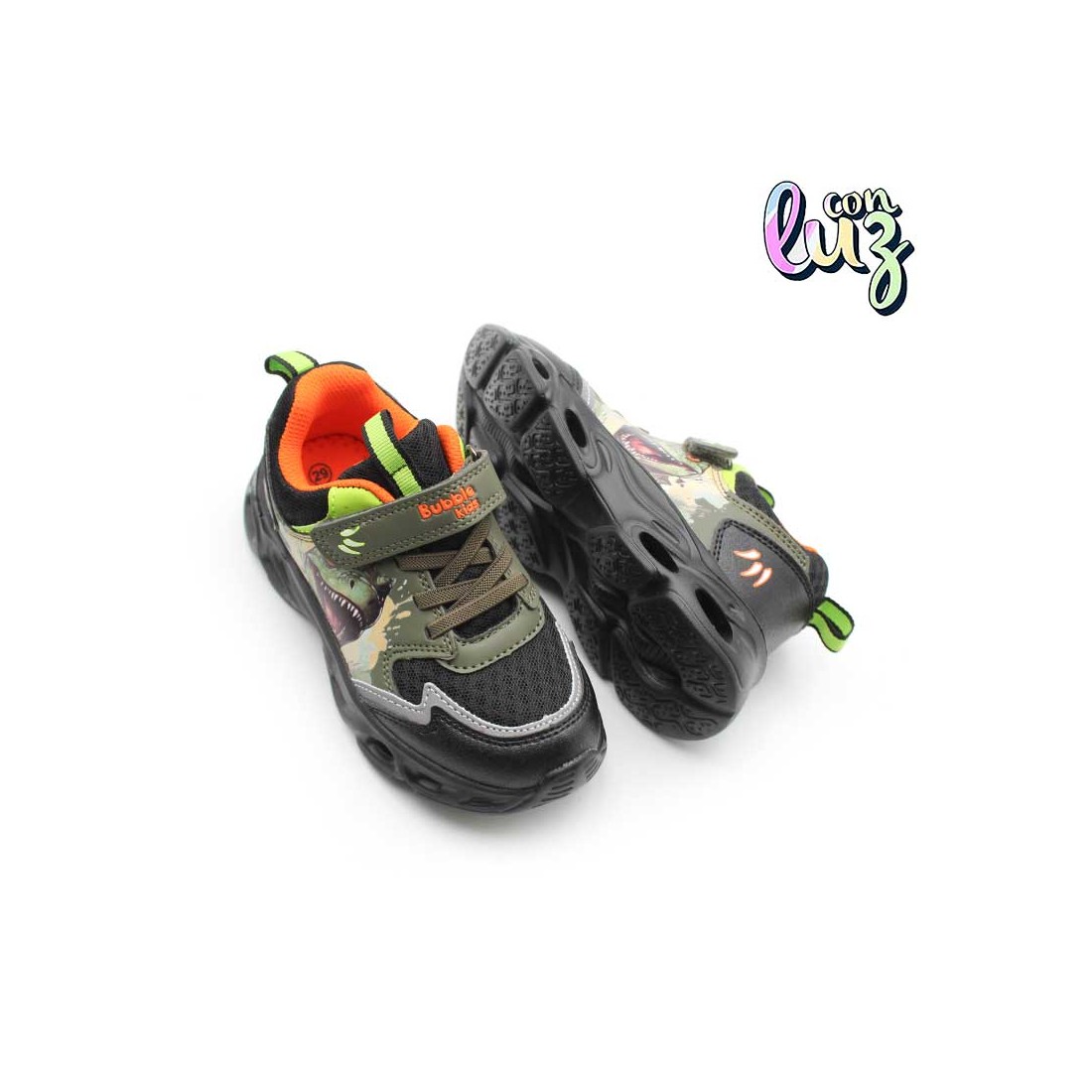 Detalles en verde camuflaje, toques neón y forro naranja que suman estilo y visibilidad. Unas deportivas todoterreno: resistentes, fáciles de limpiar y listas para jugar sin parar.