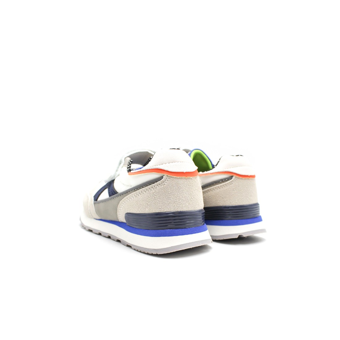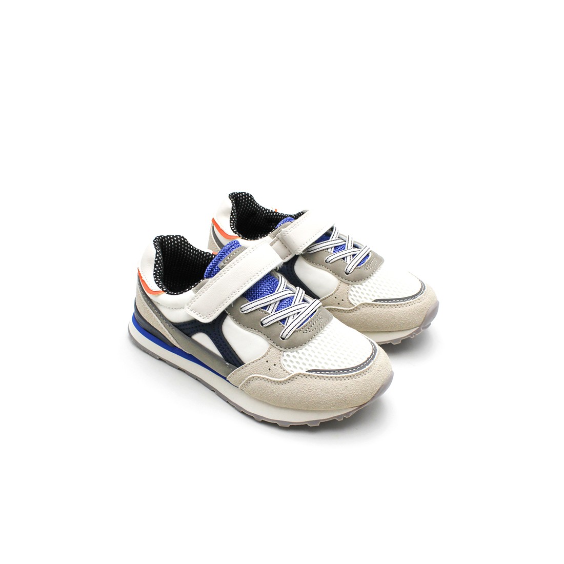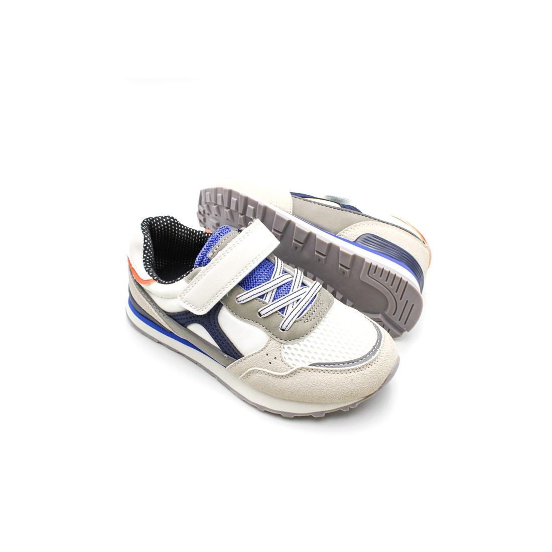 Su base en color blanco crea una línea limpia y versátil, mientras que los detalles en gris, azul marino y el sutil contraste en naranja aportan dinamismo sin recargar el diseño.