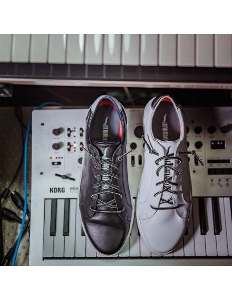 Es una zapatilla de vestir con puntera redonda, cierre de cordón elástico y suela de goma cosida antideslizante, con detalles blancos en la parte trasera y logo en relieve en la lengüeta. Incorpora plantilla extraíble.