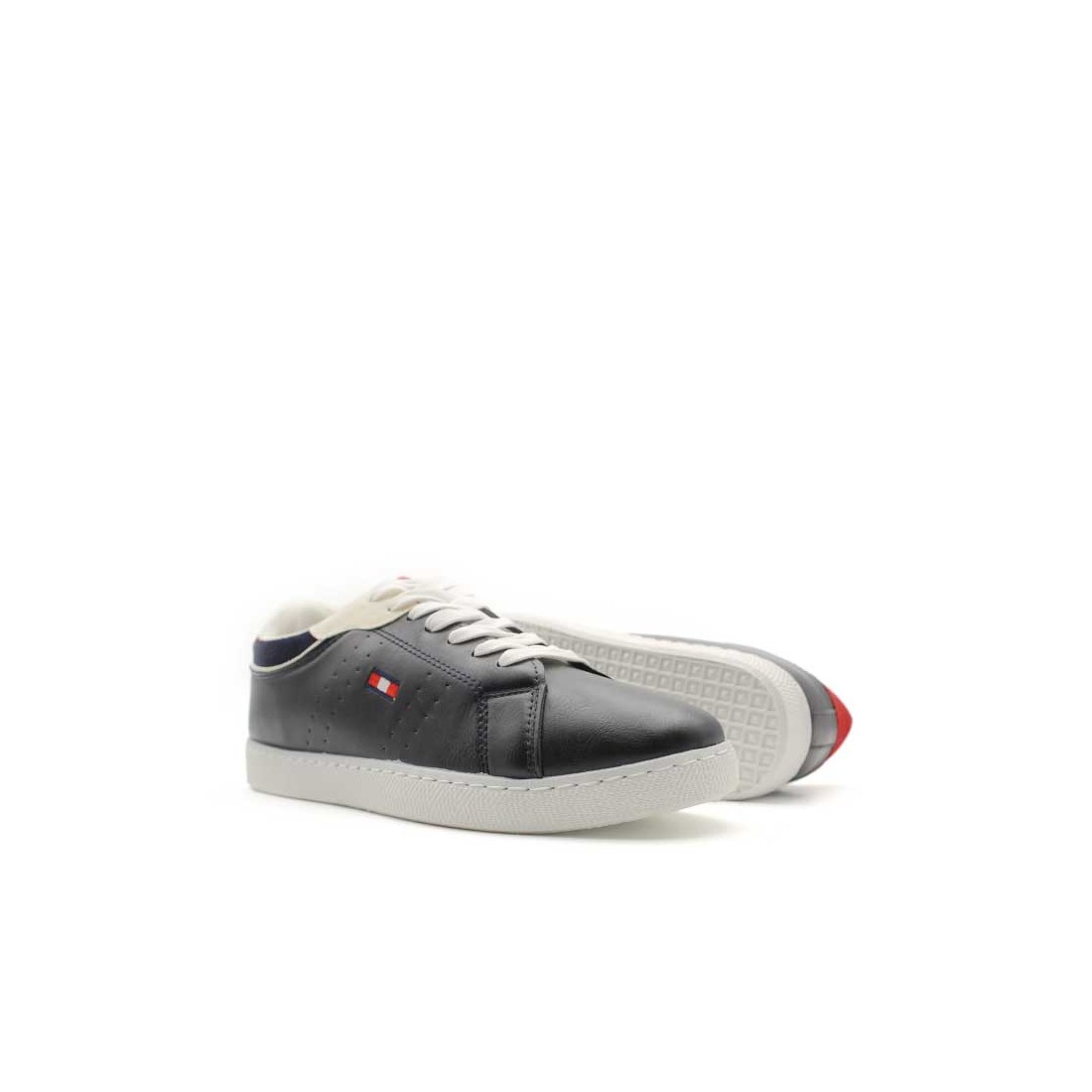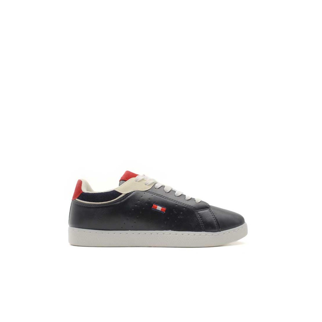 Su diseño en tono azul marino con detalles en rojo y blanco aporta un estilo moderno y deportivo, perfecto para combinar con vaqueros, pantalones casual o incluso outfits más básicos.
