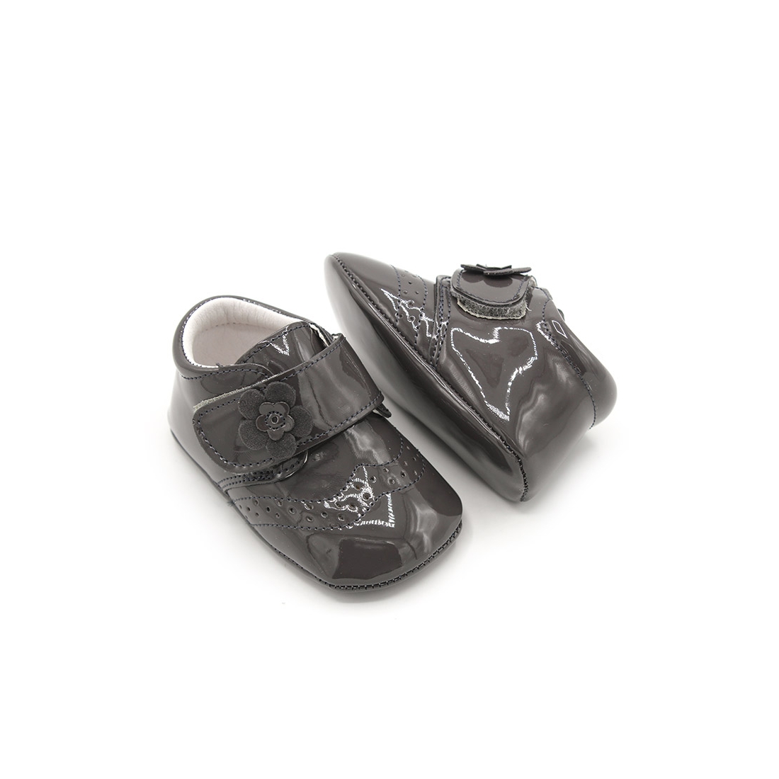 Fabricado en piel charol con suela blanda, este botín es perfecto para mantener los pies de los bebés calentitos durante los días más fríos.