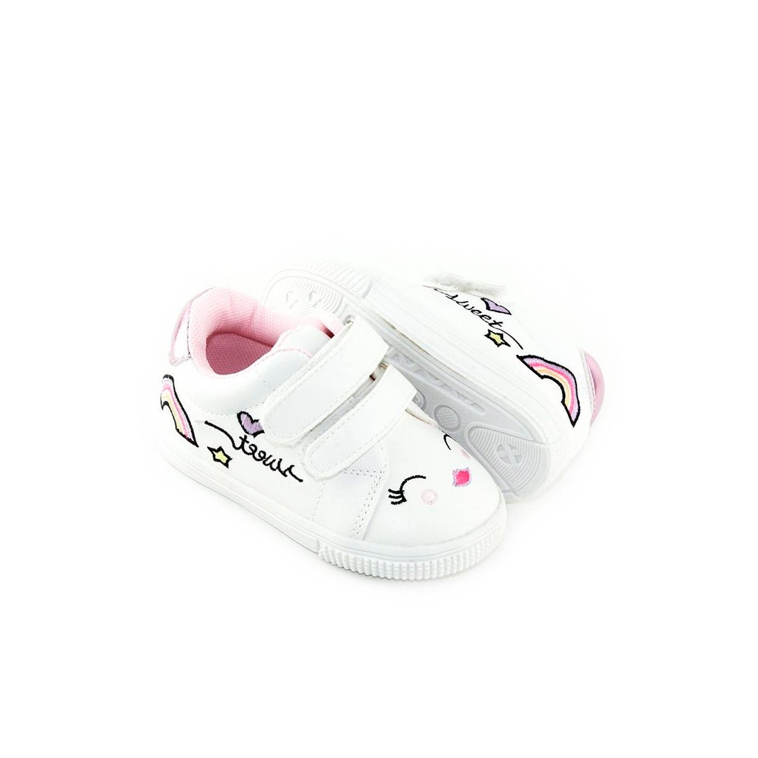 Presentamos nuestras adorables Deportivas Bebe Niña en color blanco, con un divertido dibujo de cara y arcoíris. Estas zapatillas son el complemento perfecto para los primeros pasos de tu pequeña, combinando estilo y comodidad, añadiendo un toque de diversión a cualquier conjunto.