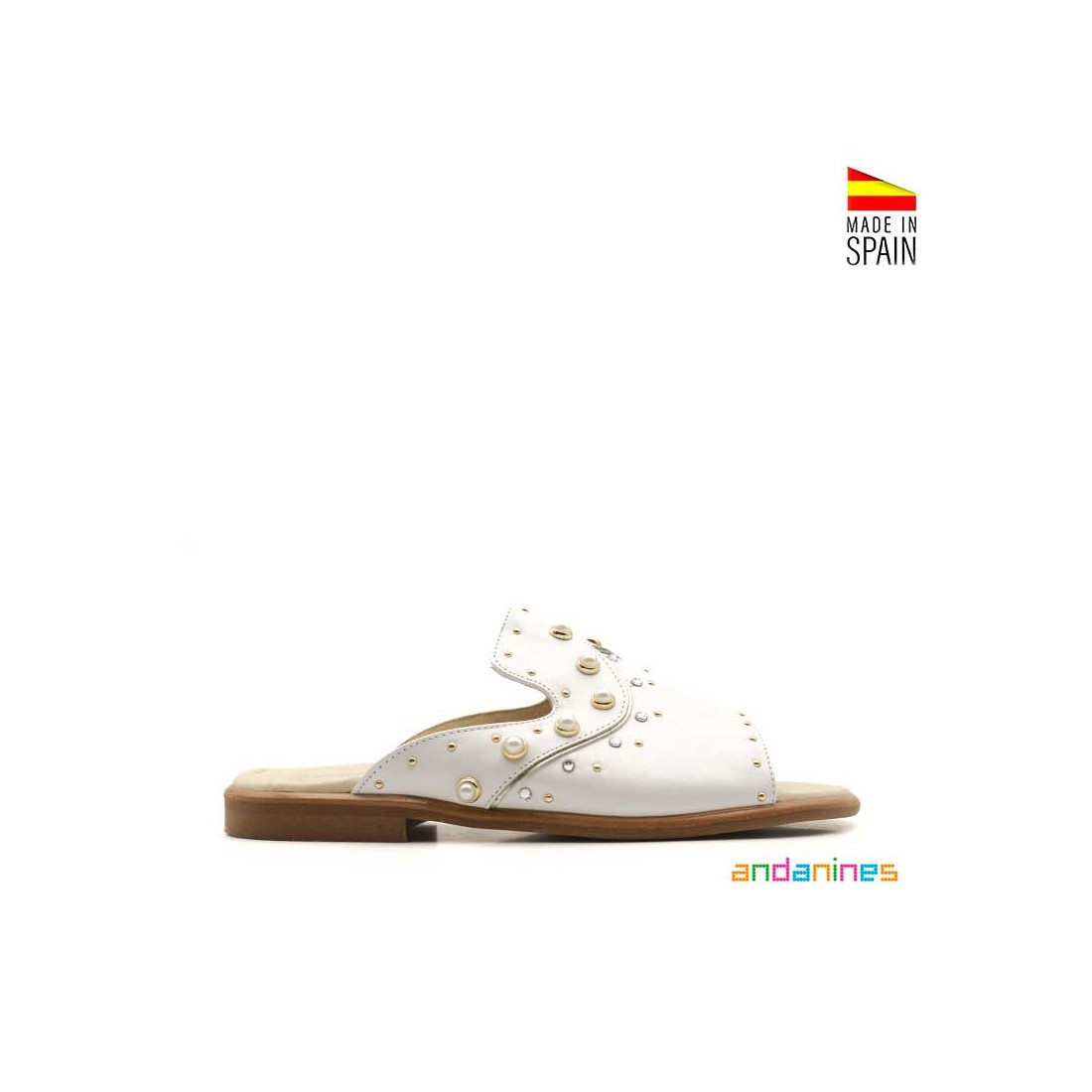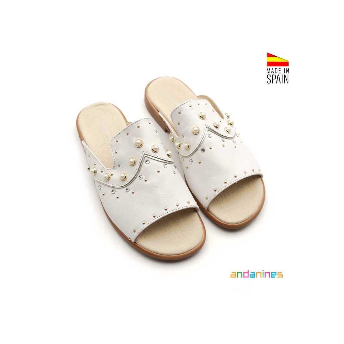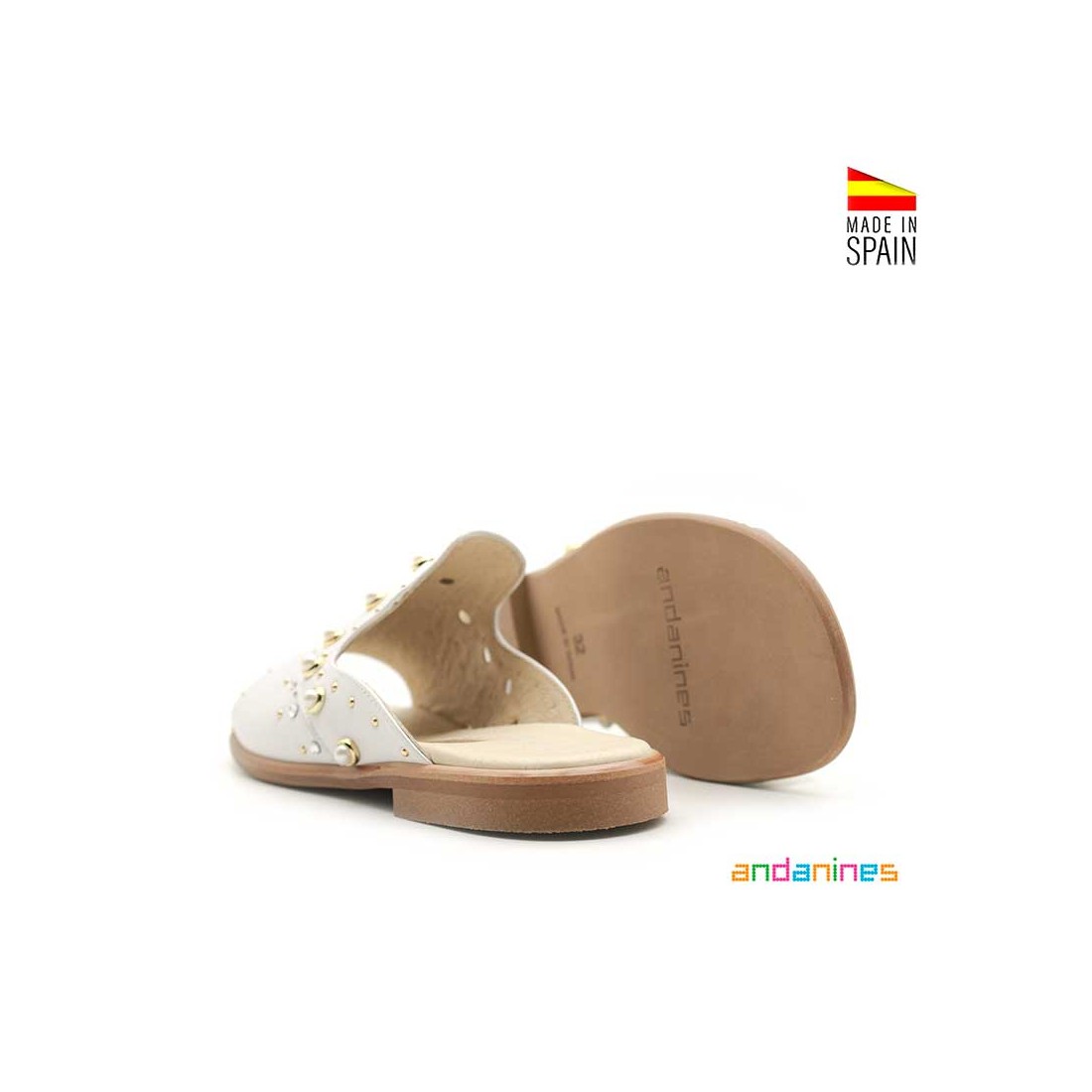 Confeccionadas en piel blanca, incorporan una cuidada decoración de perlas, remaches y tachuelas metálicas que añade un toque sofisticado y especial, ideal para combinar con vestidos de comunión o conjuntos más informales para ocasiones especiales.