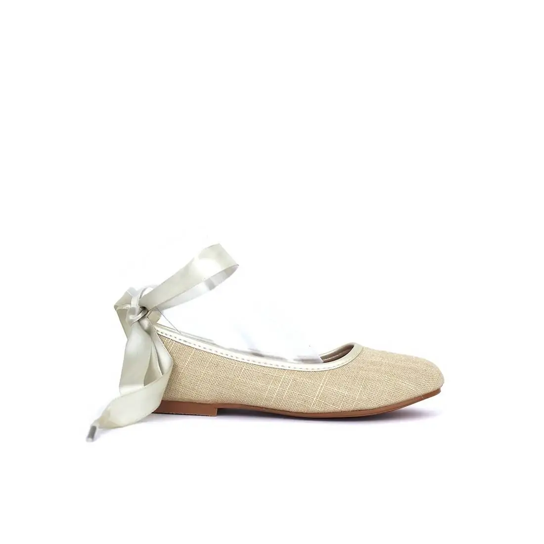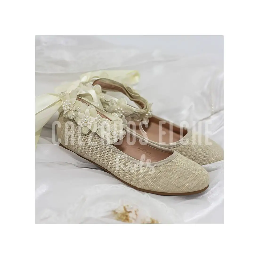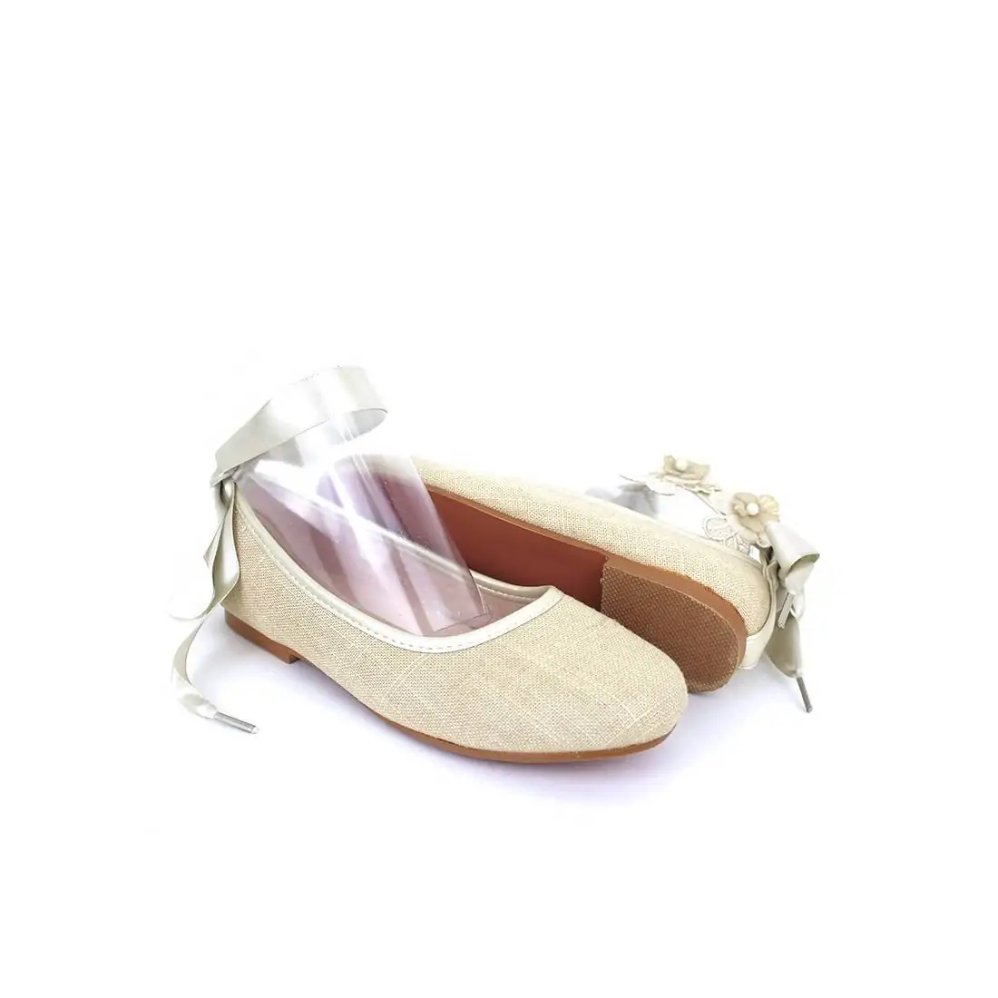 Zapatos estilo manoletinas o bailarinas deniña para comunión o vestir en color beige. Dispone de dos lazadas a elegir; una de floras y otra cinta de raso. Fabricado en textil y polipiel. De la marca Bubble bobble. Producto de importación.