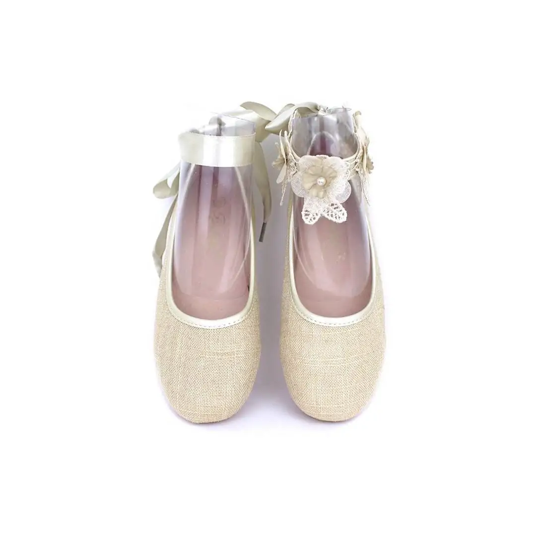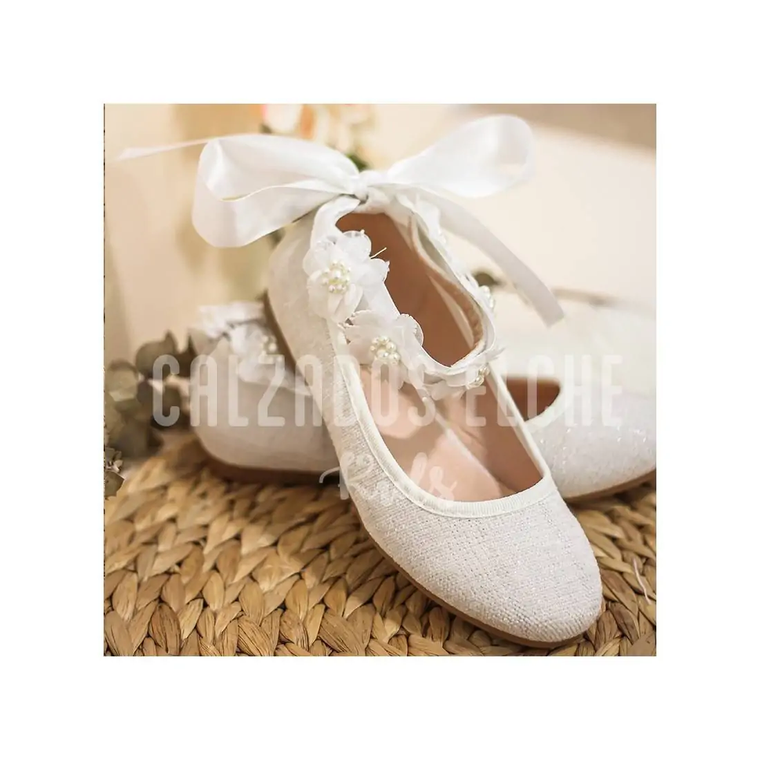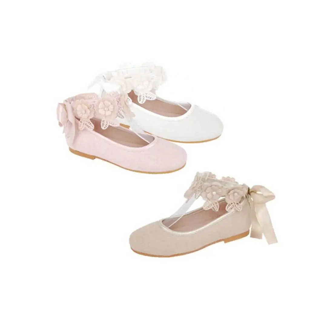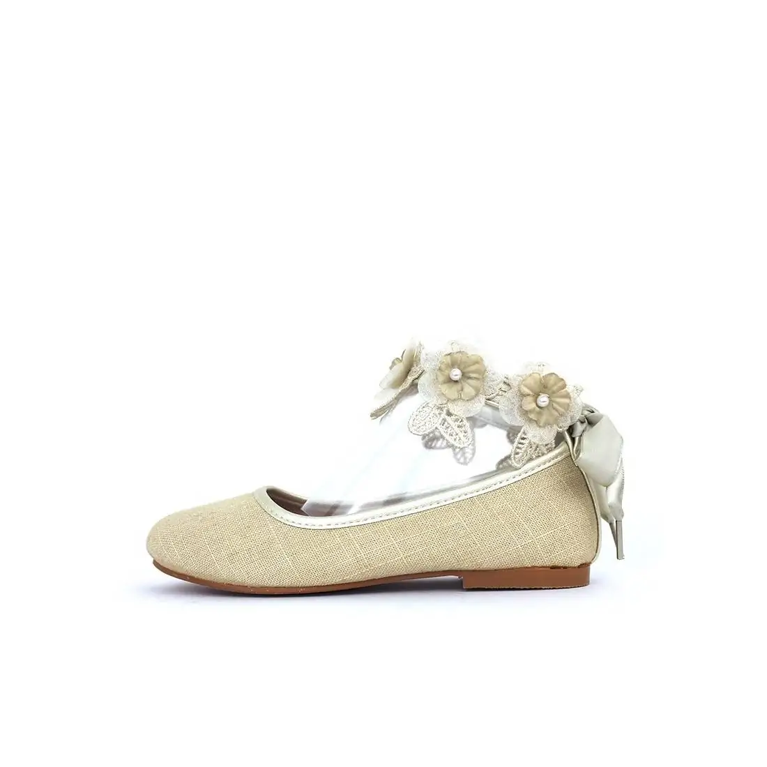 Zapatos estilo manoletinas o bailarinas deniña para comunión o vestir en color beige. Dispone de dos lazadas a elegir; una de floras y otra cinta de raso. Fabricado en textil y polipiel. De la marca Bubble bobble. Producto de importación.