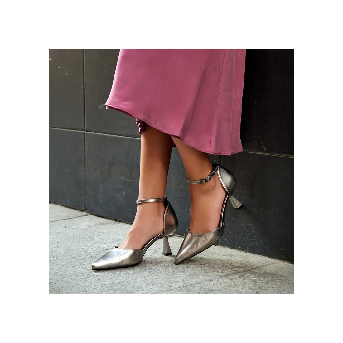Un zapato de tacón pensado para destacar sin estridencias, donde el metalizado plomo se convierte en el aliado perfecto para elevar cualquier look con un giro contemporáneo. Producto de importación, de la marca Buonarotti.
