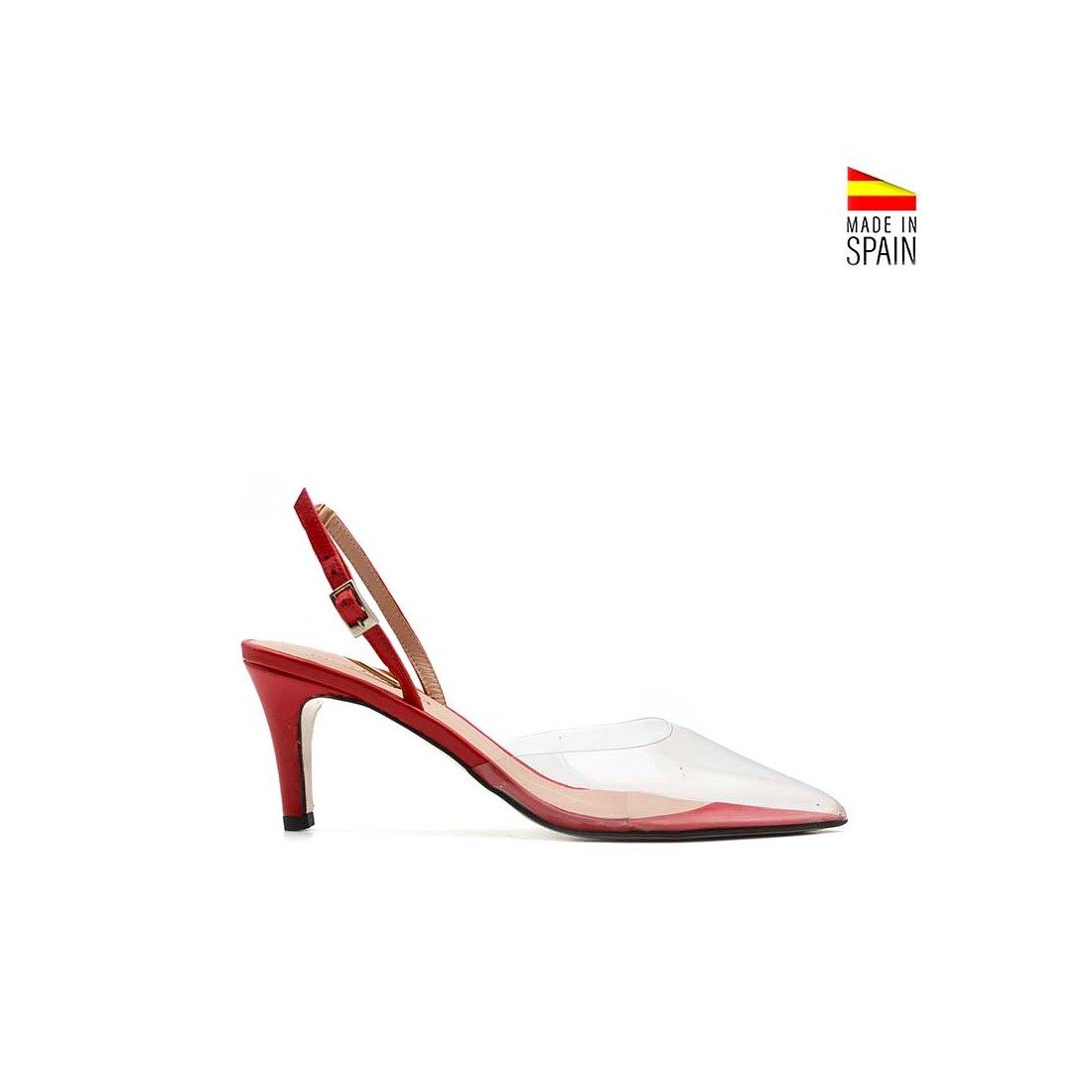 Estos zapatos de vestir combinan diseño actual y elegancia clásica gracias a la mezcla de vinilo transparente y piel en color rojo, creando un efecto visual ligero y muy estiloso que realza el pie.