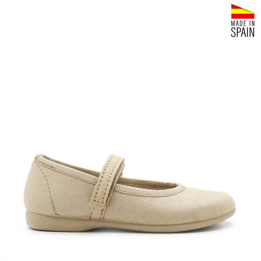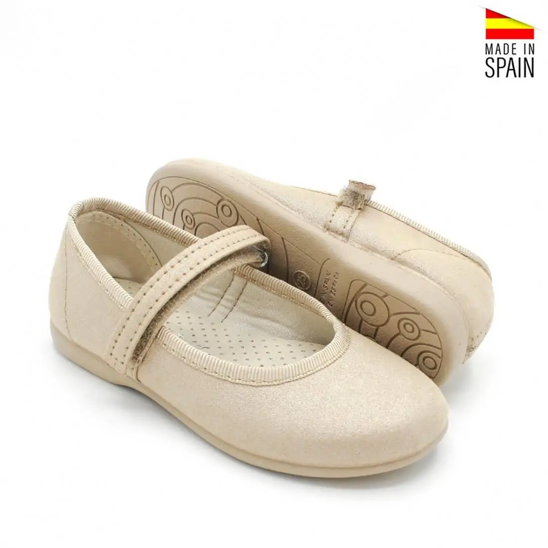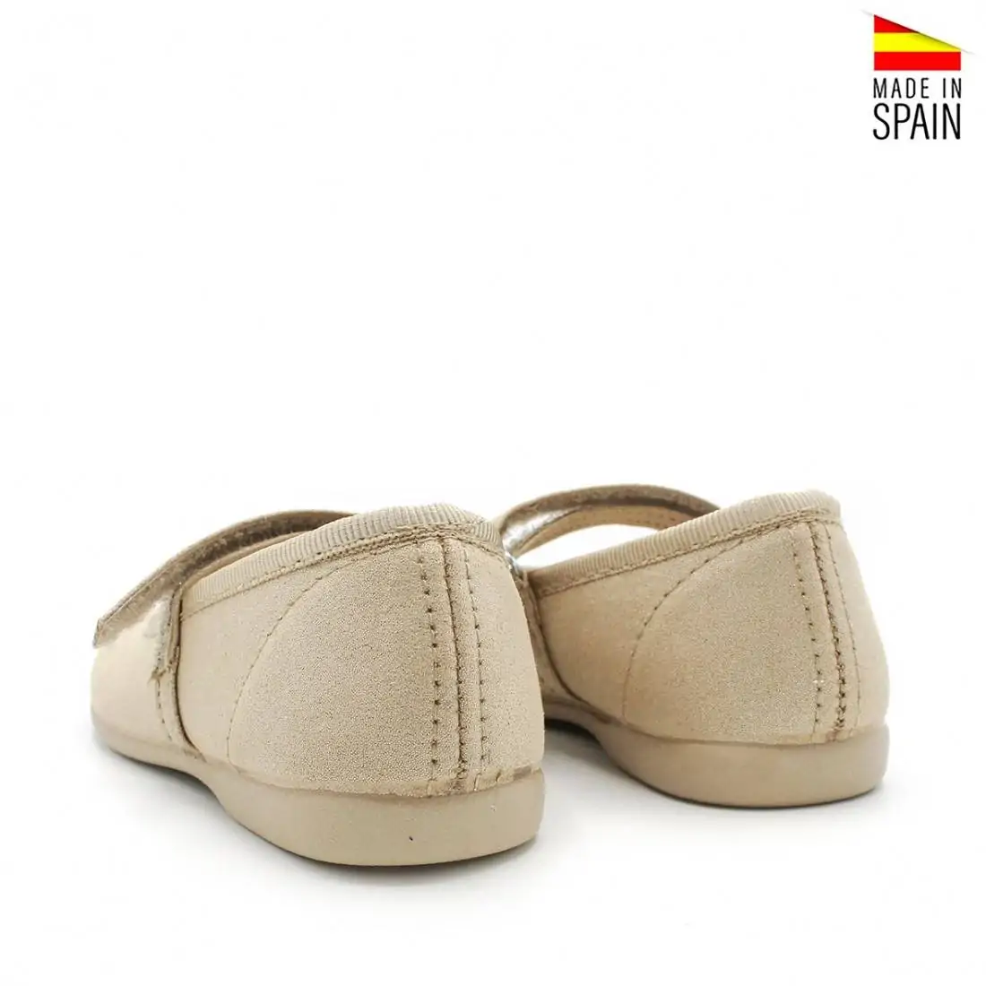 Están confeccionados en tela suave, pensada para respetar la pisada y ofrecer una sensación cómoda durante todo el uso. La pulsera al empeine con cierre de velcro asegura un ajuste práctico y estable, además de facilitar que la niña pueda calzarse con autonomía. Este cierre permite añadir complementos intercambiables, como flores o lazos, adaptando el zapato a cada ocasión y conjunto.