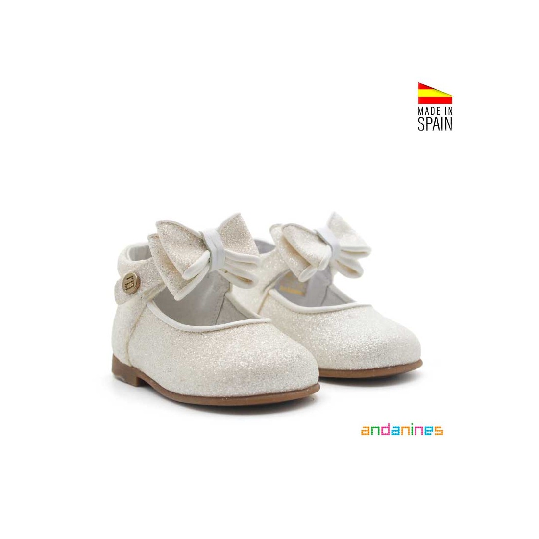 Se trata de unas merceditas en color blanco con acabado glitter que aportan luz y estilo a cualquier look, ideales para celebraciones, ceremonias o simplemente para sentirse especial.